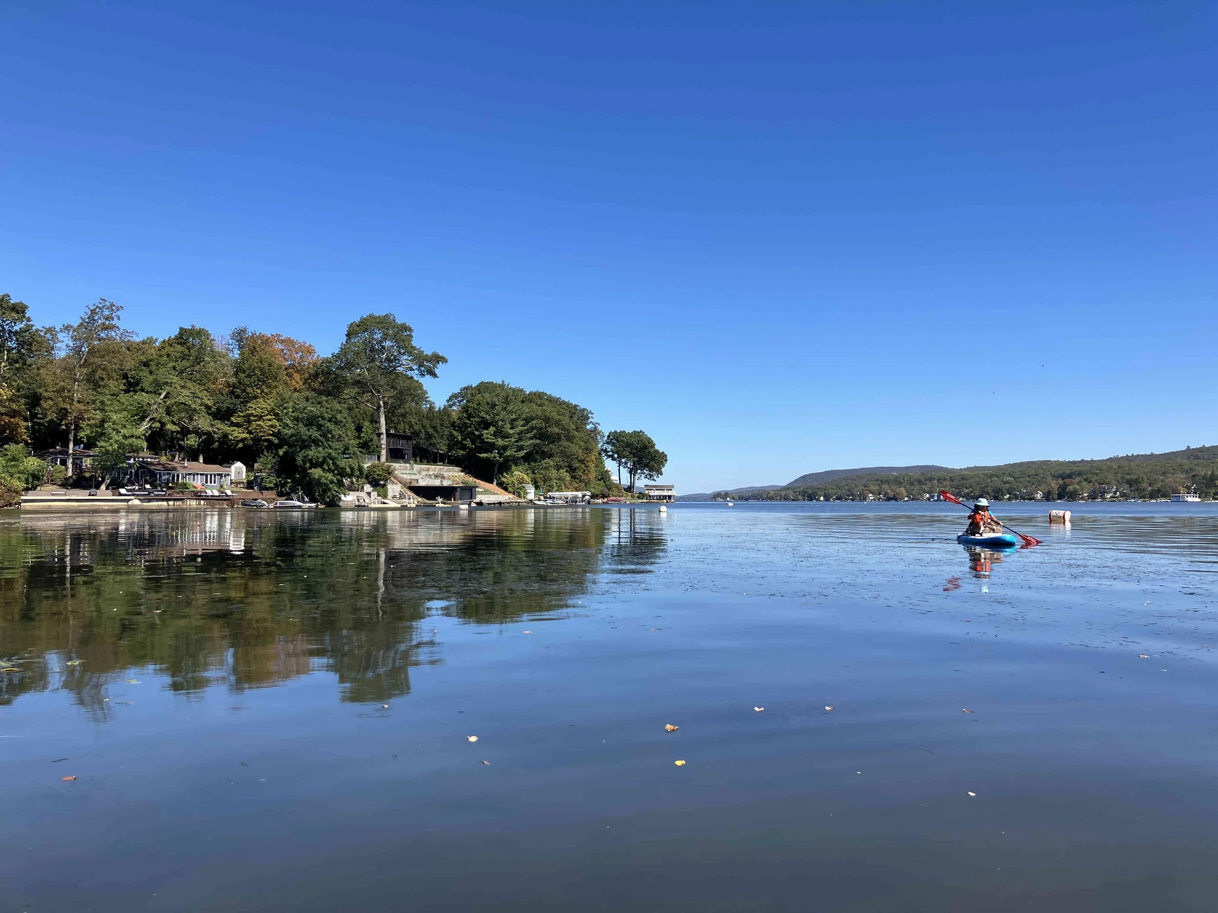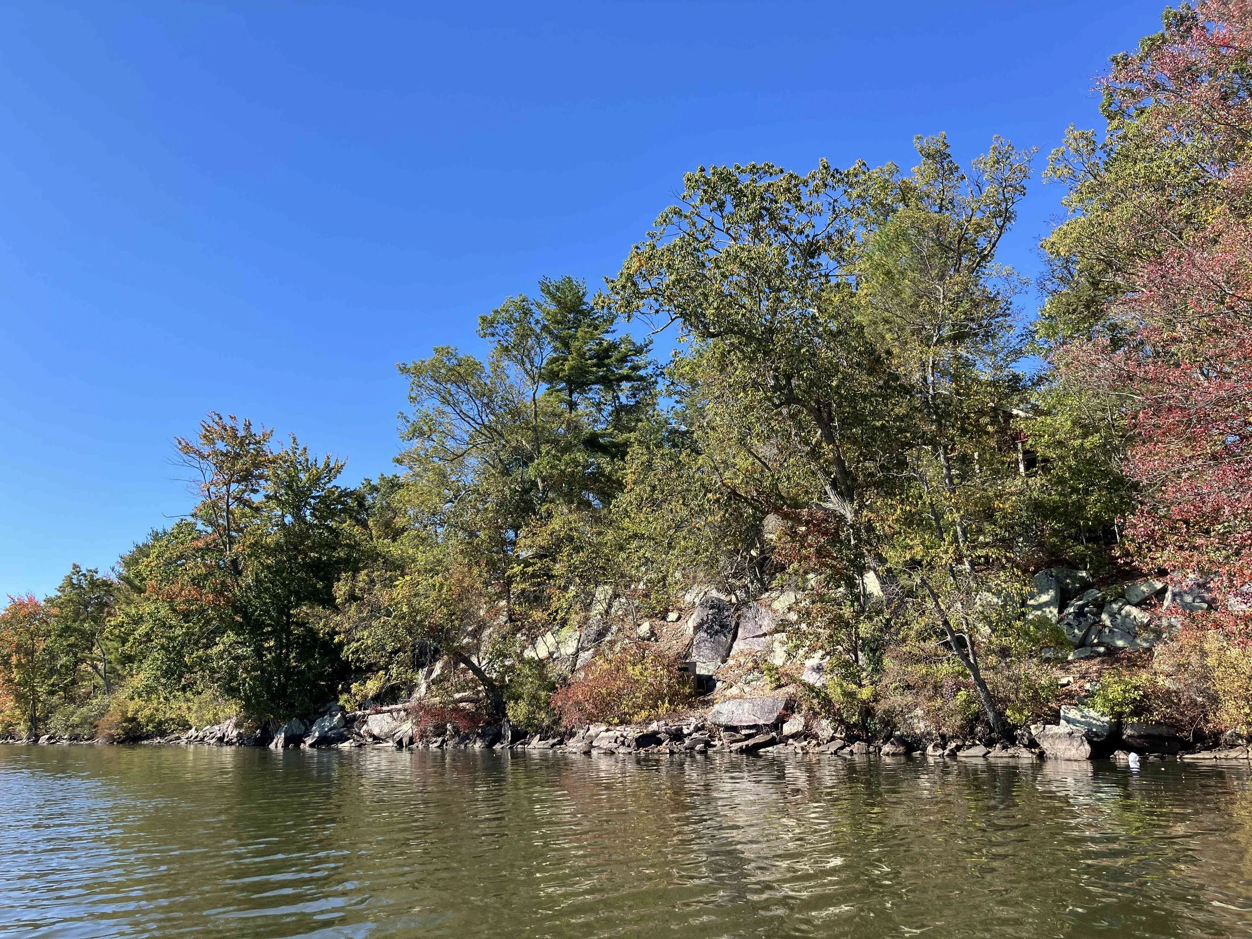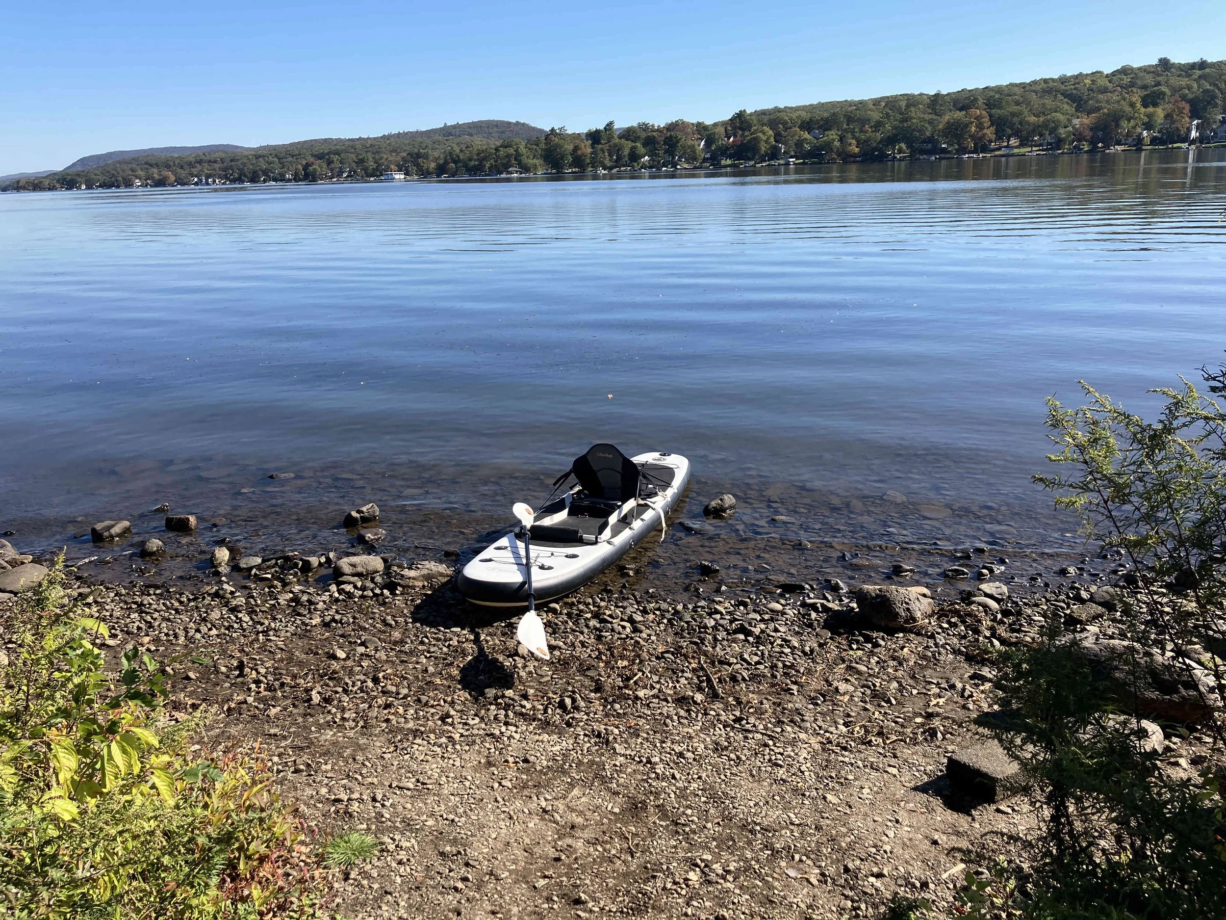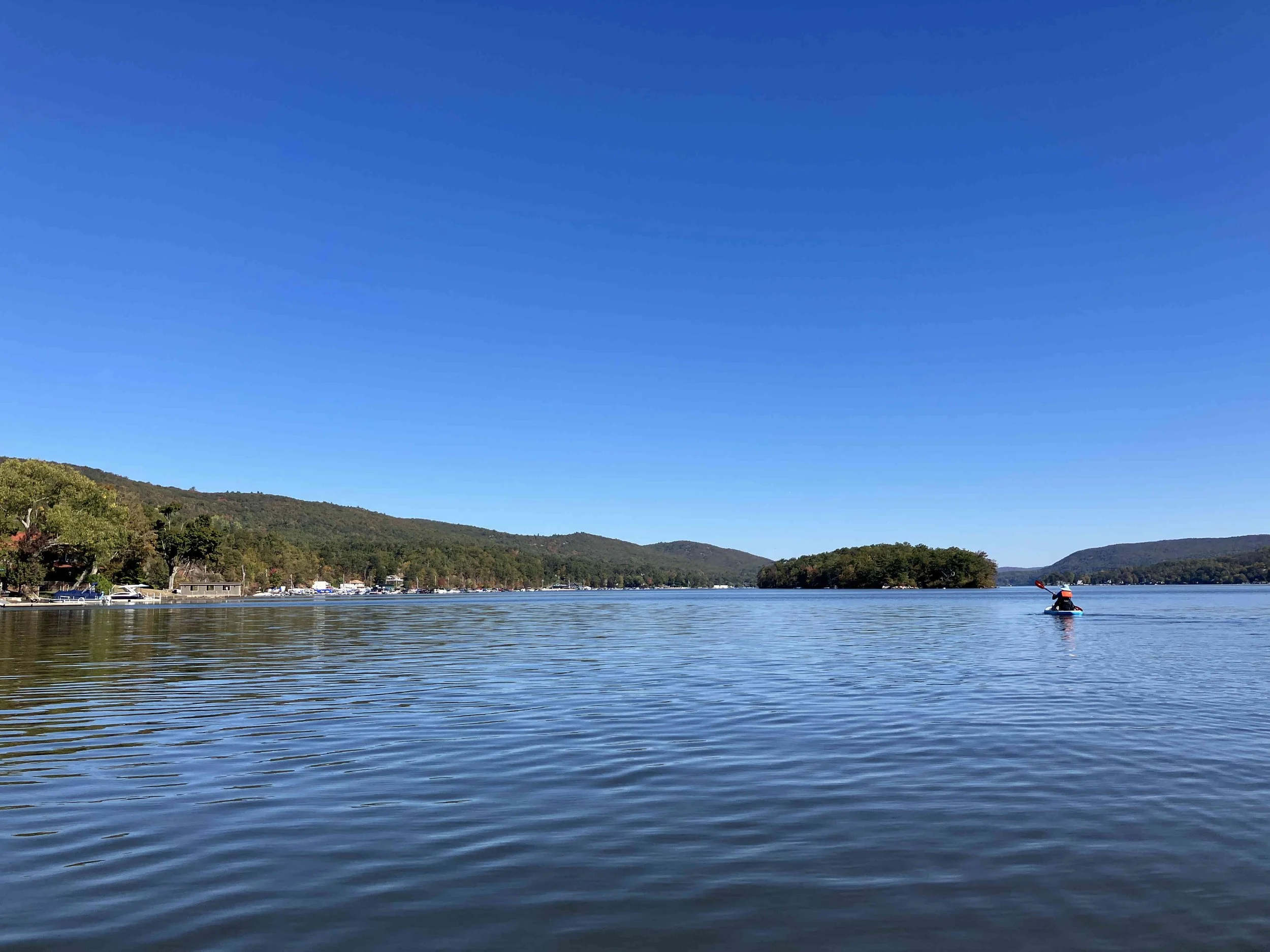 Greenwood Lake is pretty, but there may be strong winds. There are oodles of motorboats on the lake, so there also may be wakes. We visited on a weekday during school season, so we enjoyed a calm lake (see pictures below). We paddled north, around Fox Island, and then back.