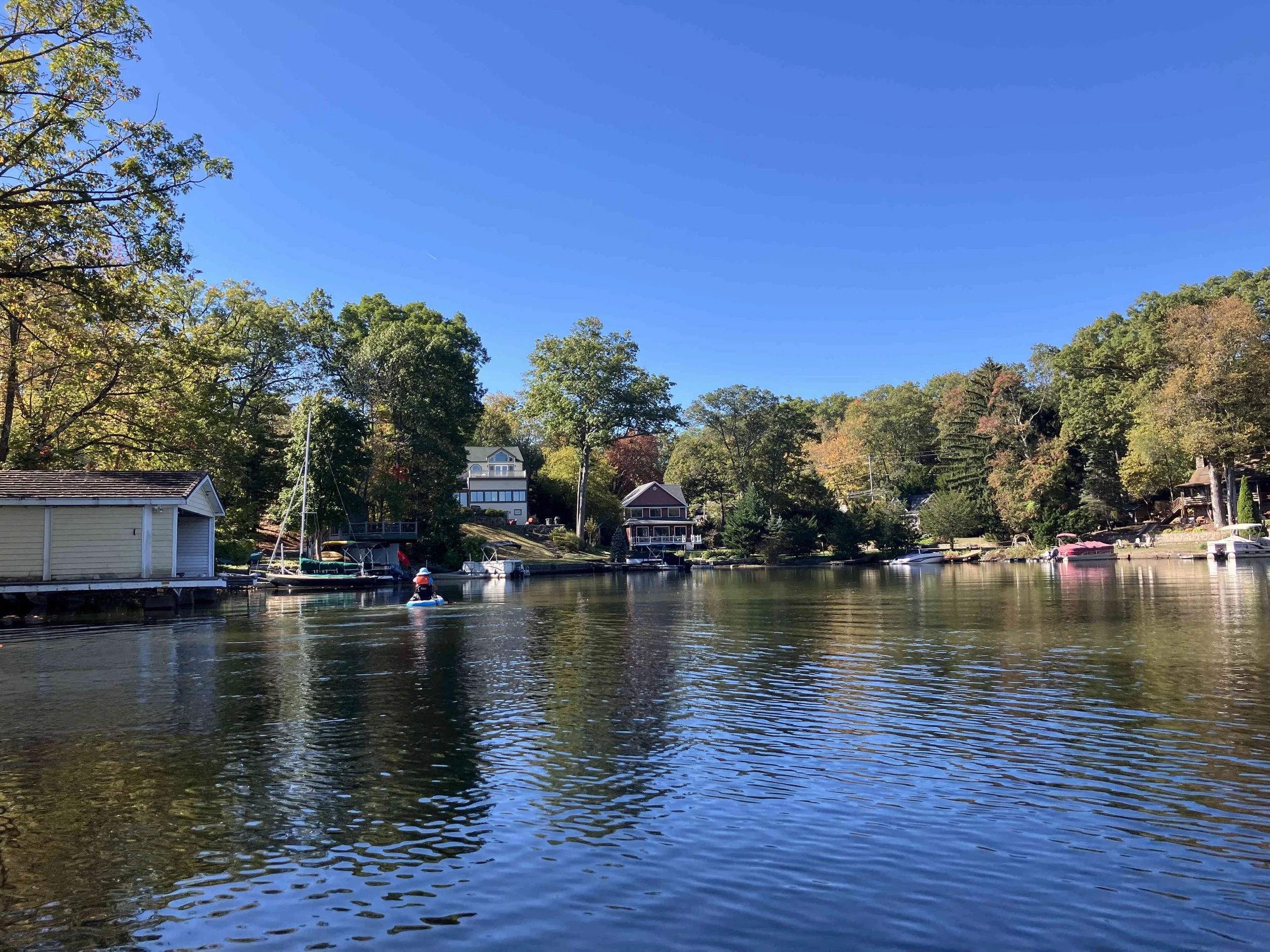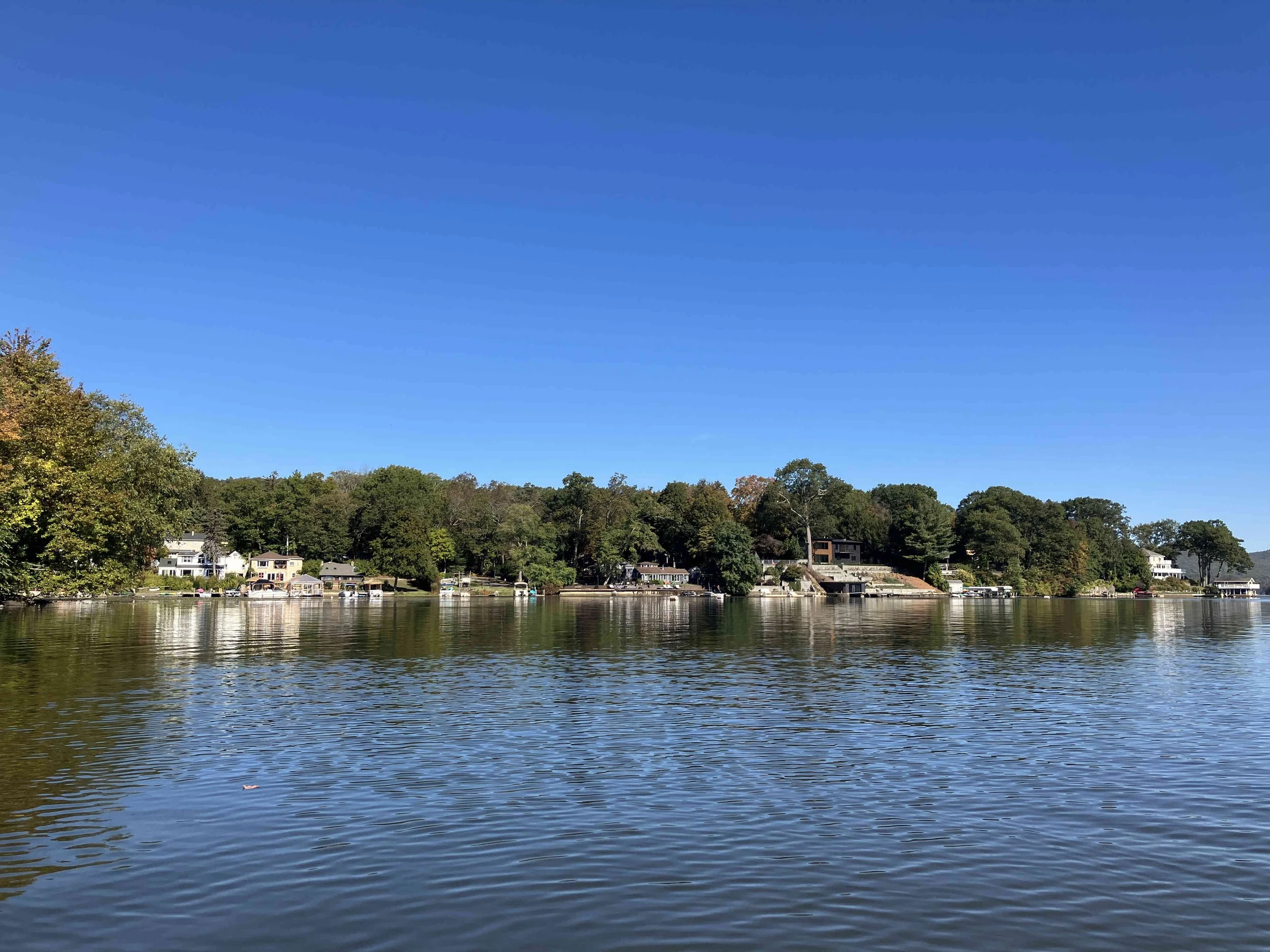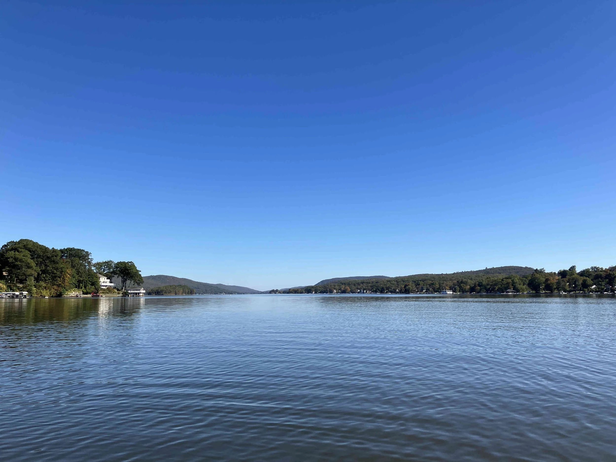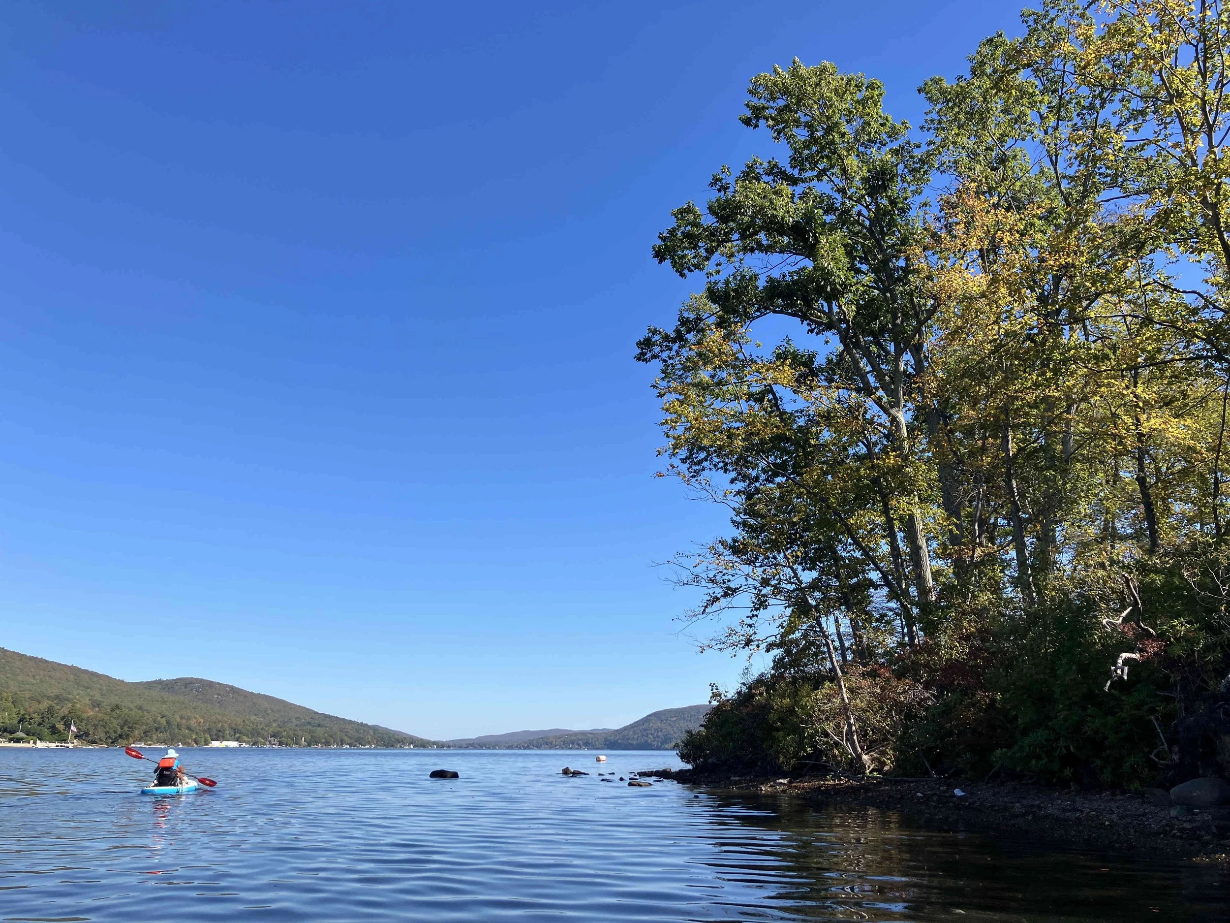 Greenwood Lake is pretty, but there may be strong winds. There are oodles of motorboats on the lake, so there also may be wakes. We visited on a weekday during school season, so we enjoyed a calm lake (see pictures below). We paddled north, around Fox Island, and then back.