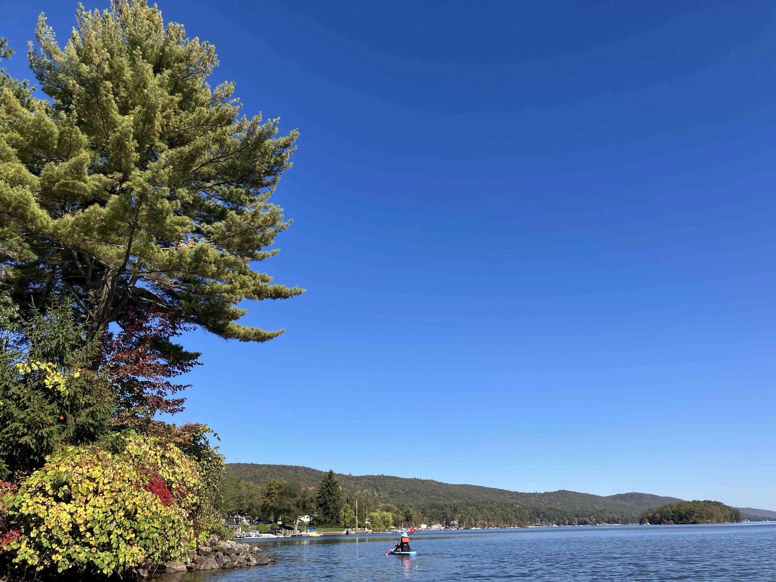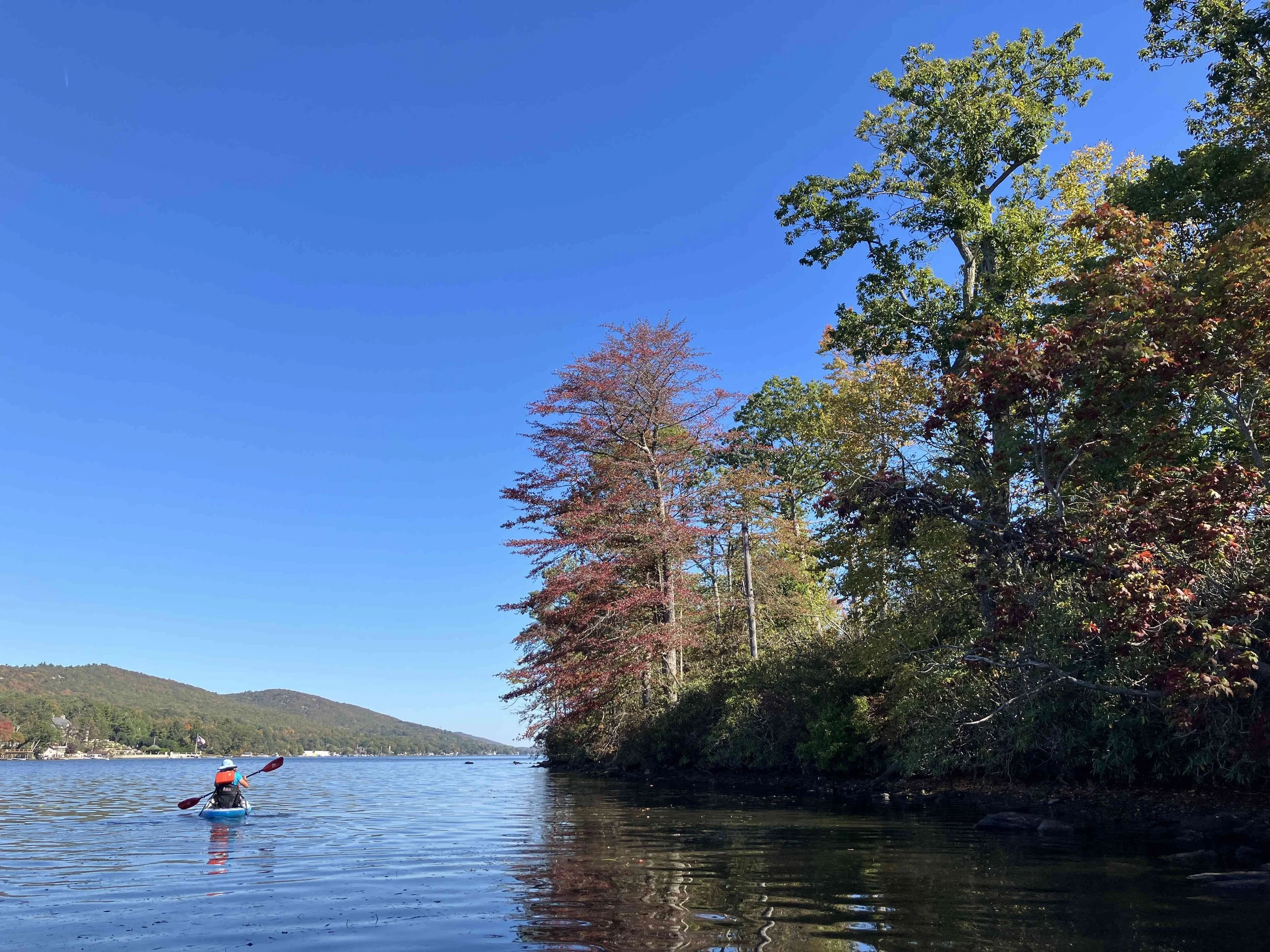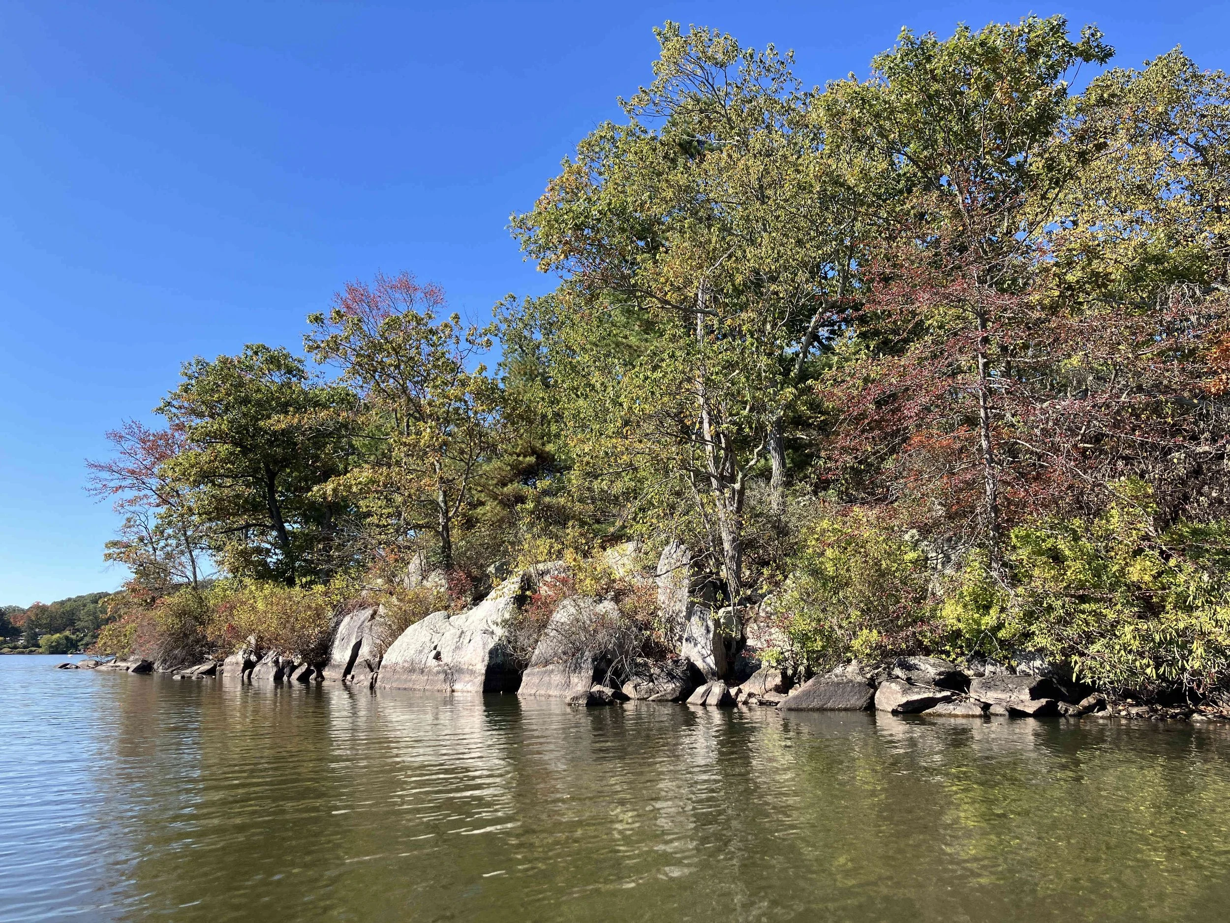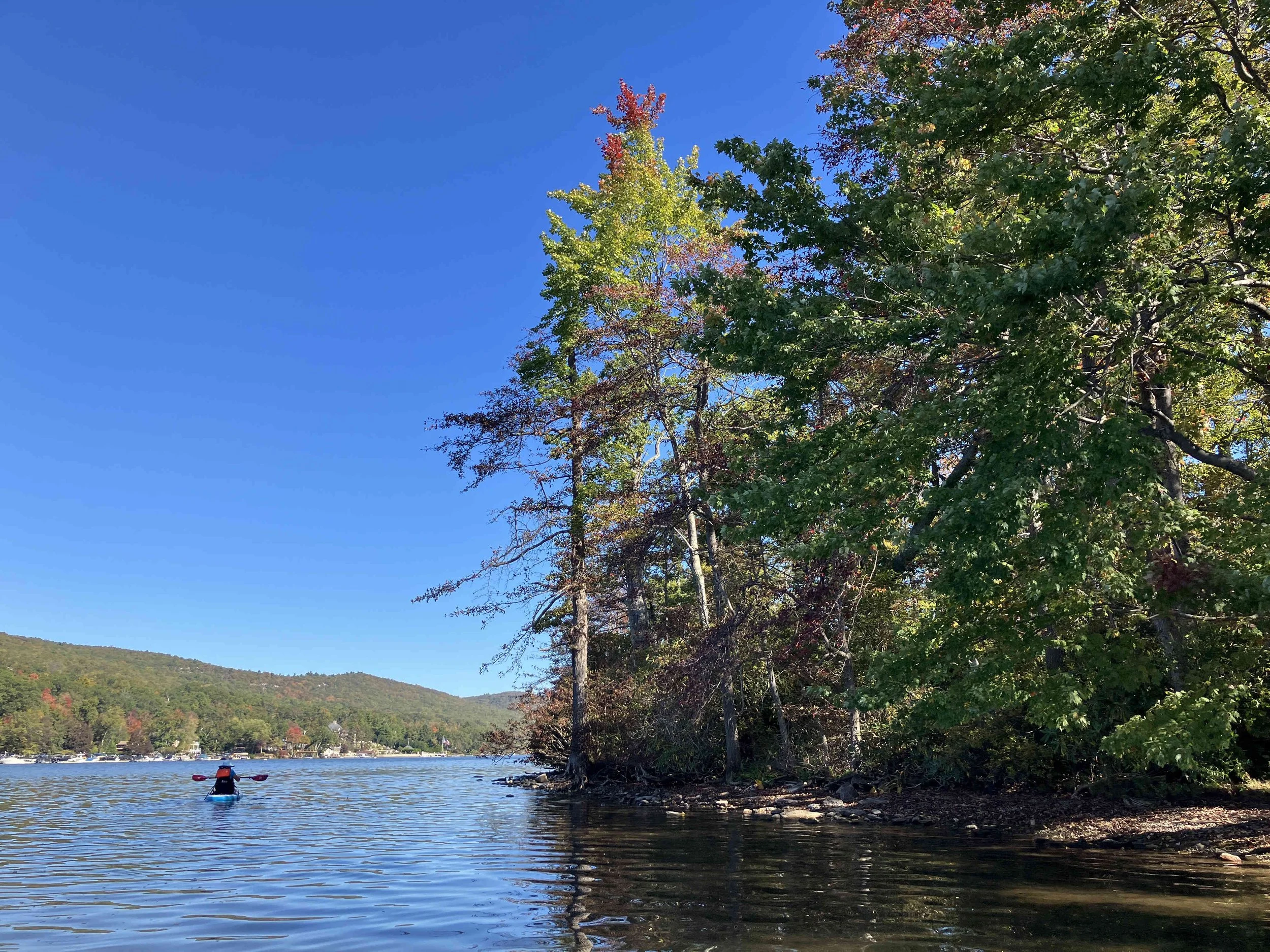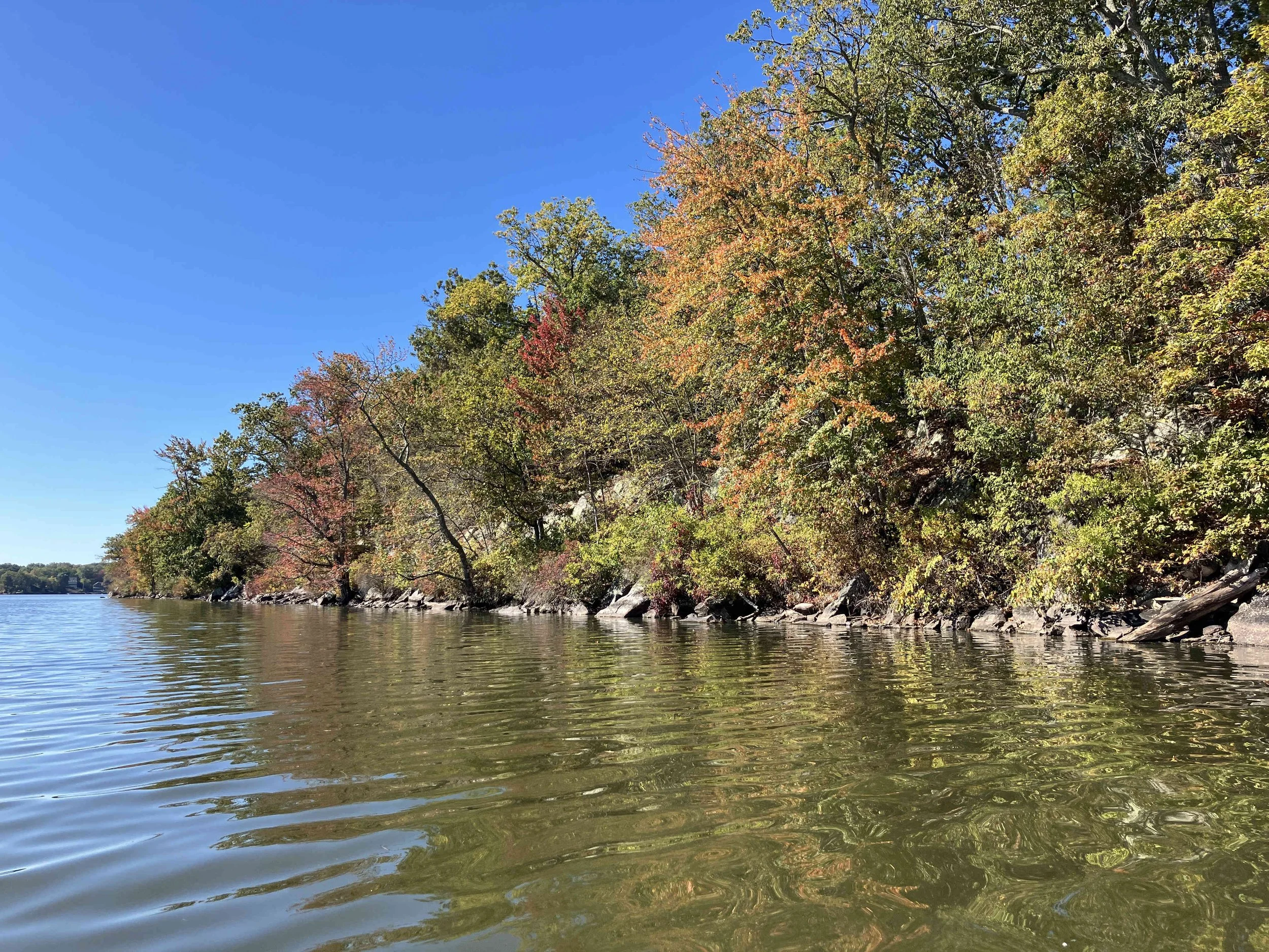 Greenwood Lake is pretty, but there may be strong winds. There are oodles of motorboats on the lake, so there also may be wakes. We visited on a weekday during school season, so we enjoyed a calm lake (see pictures below). We paddled north, around Fox Island, and then back.