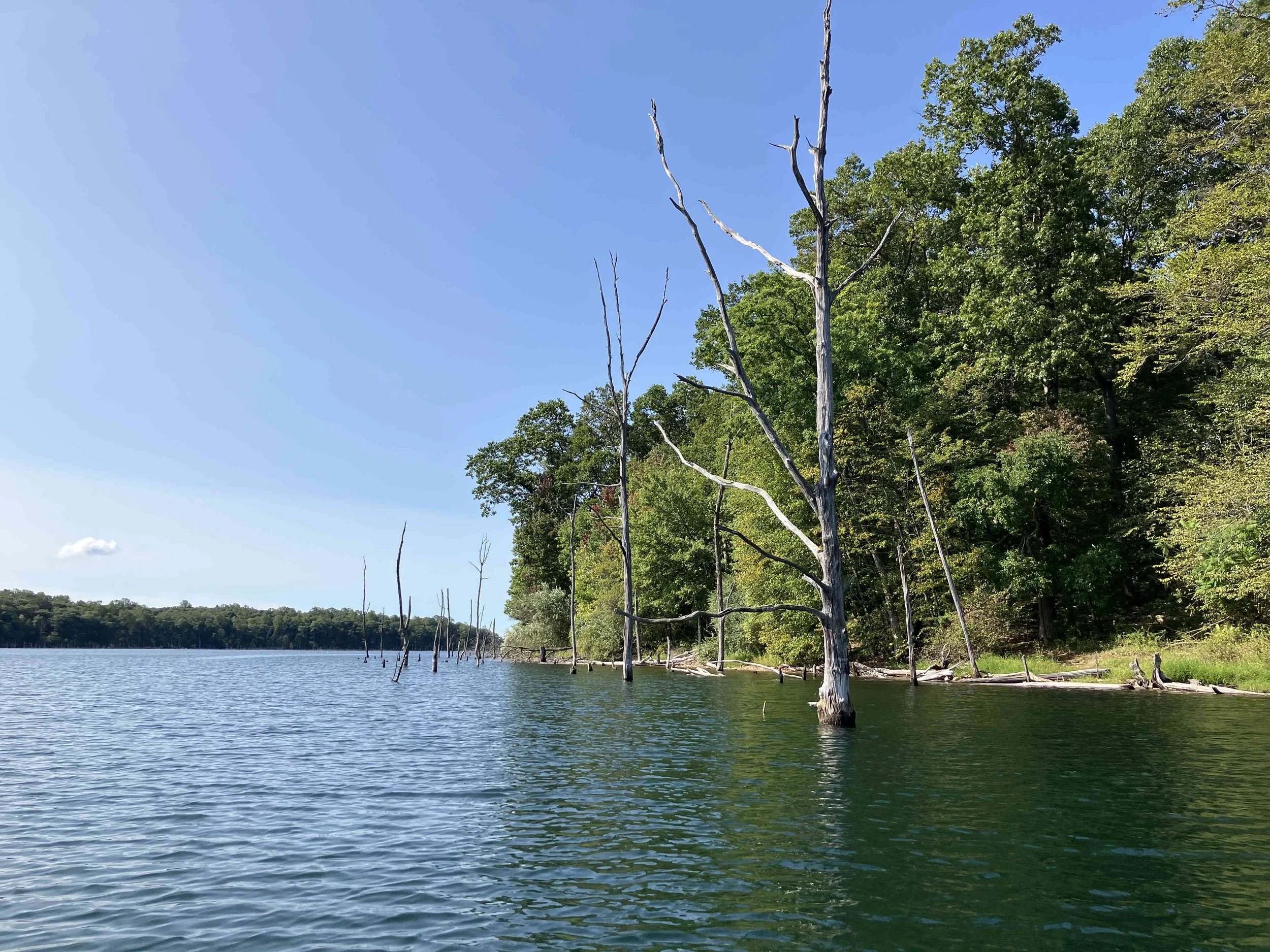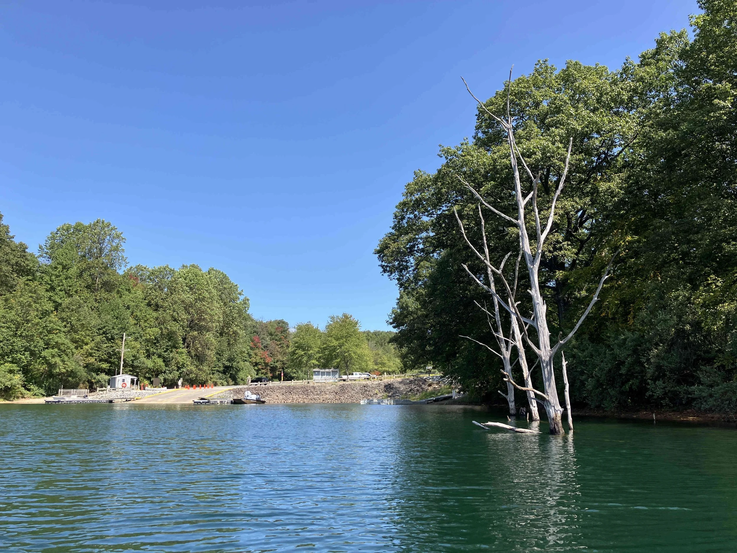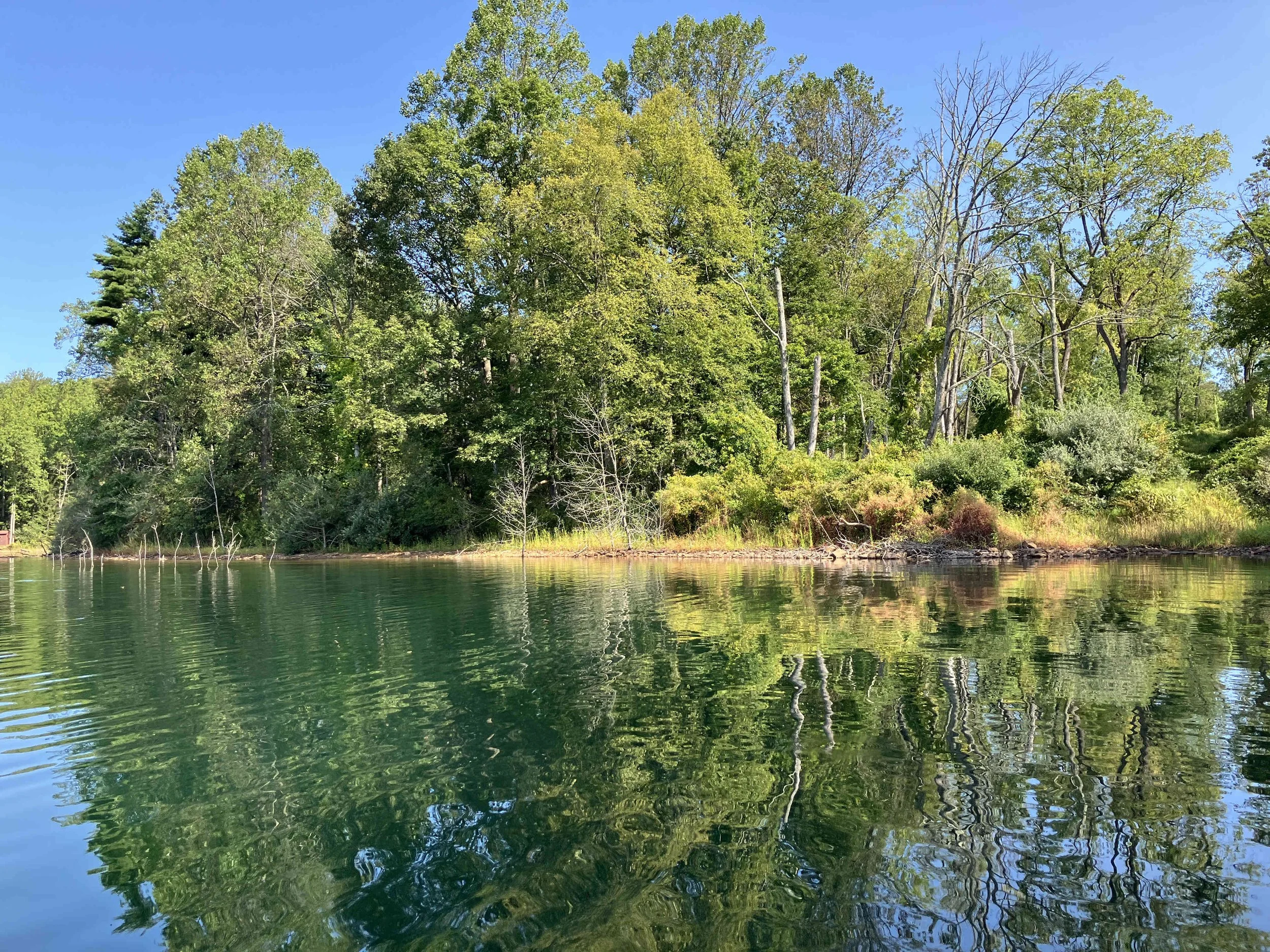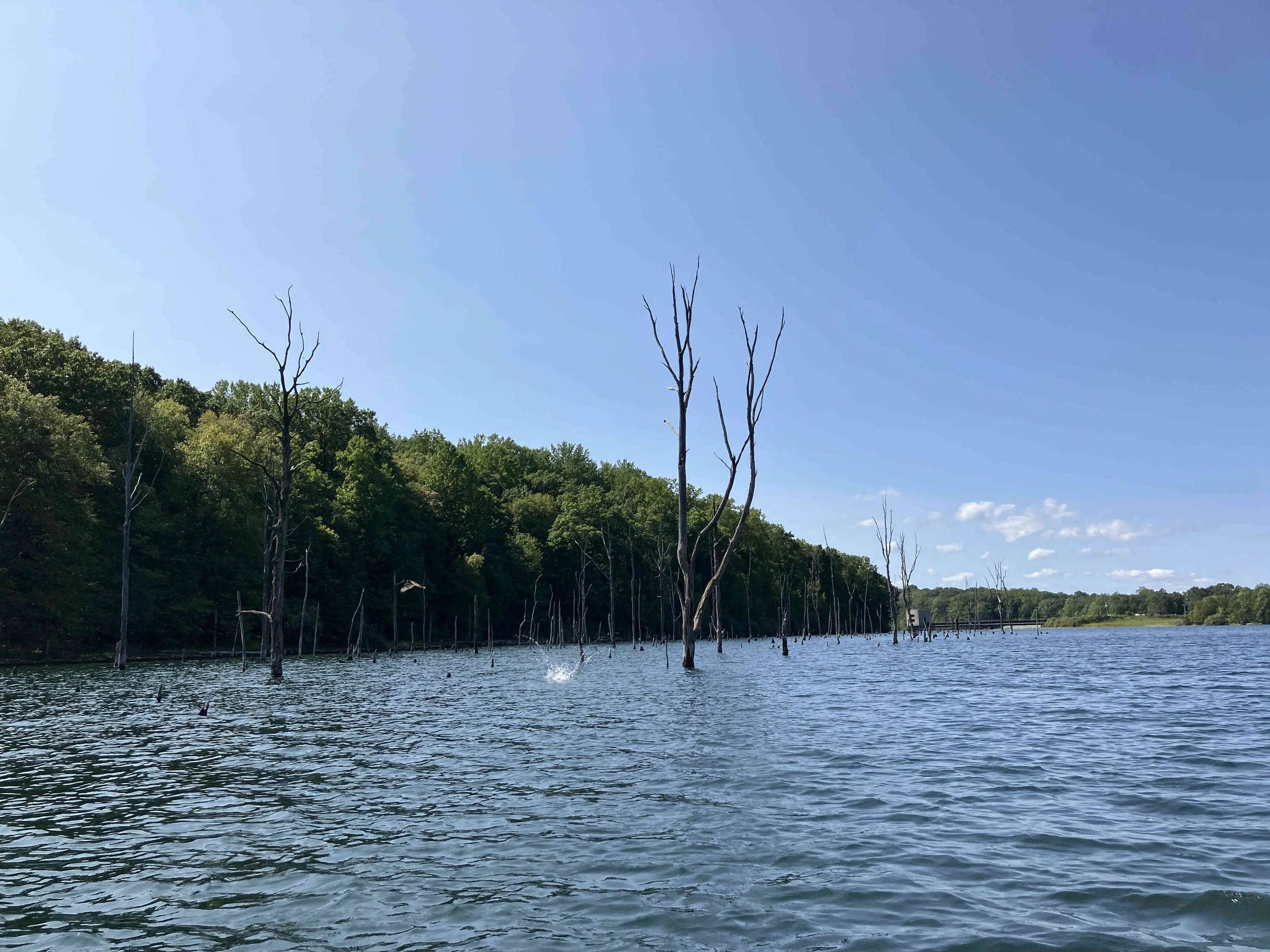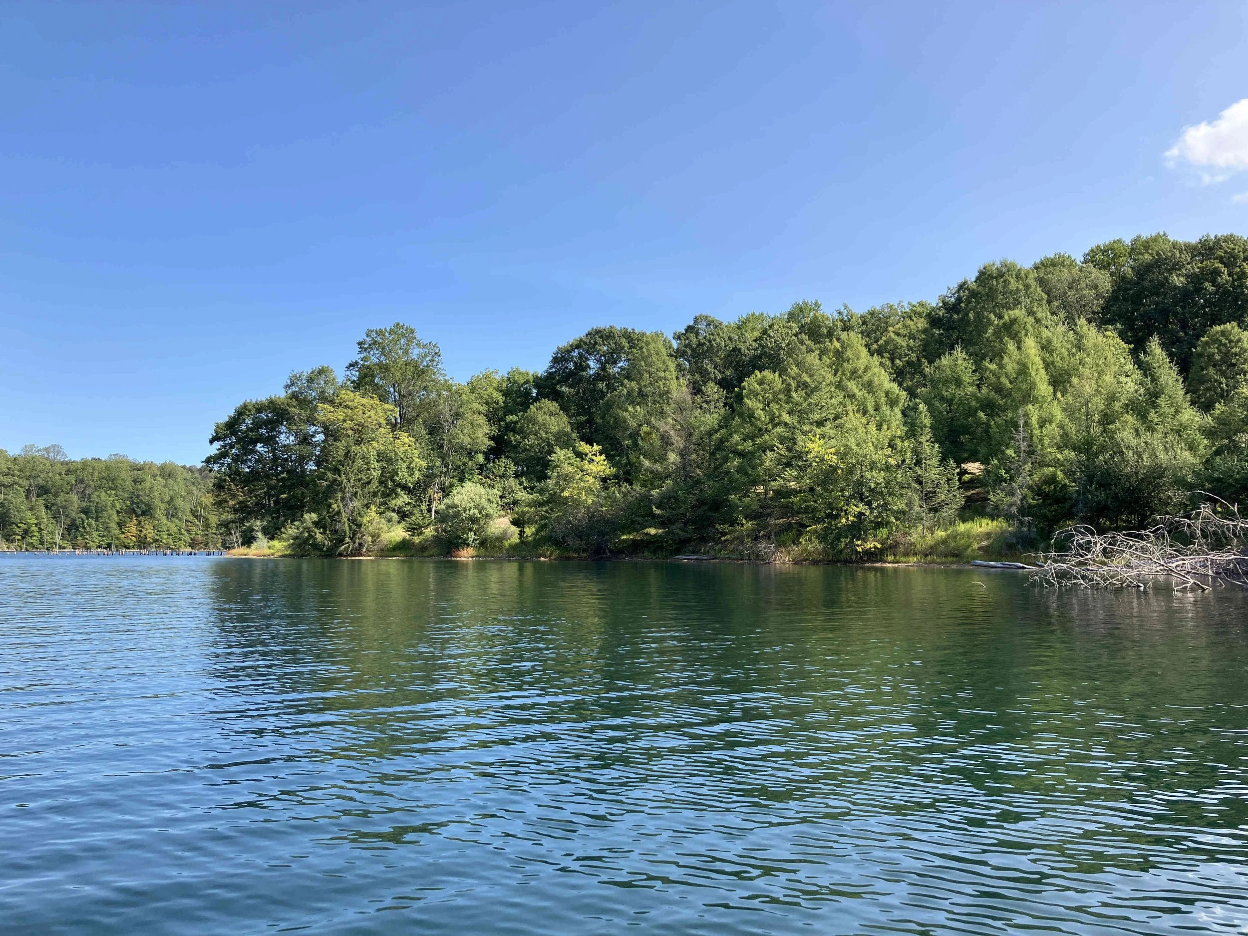 The launch site is at the end of Merrill Creek Road. Much of the shoreline had dead trees sticking out of the water. Be careful. The lake is pretty.