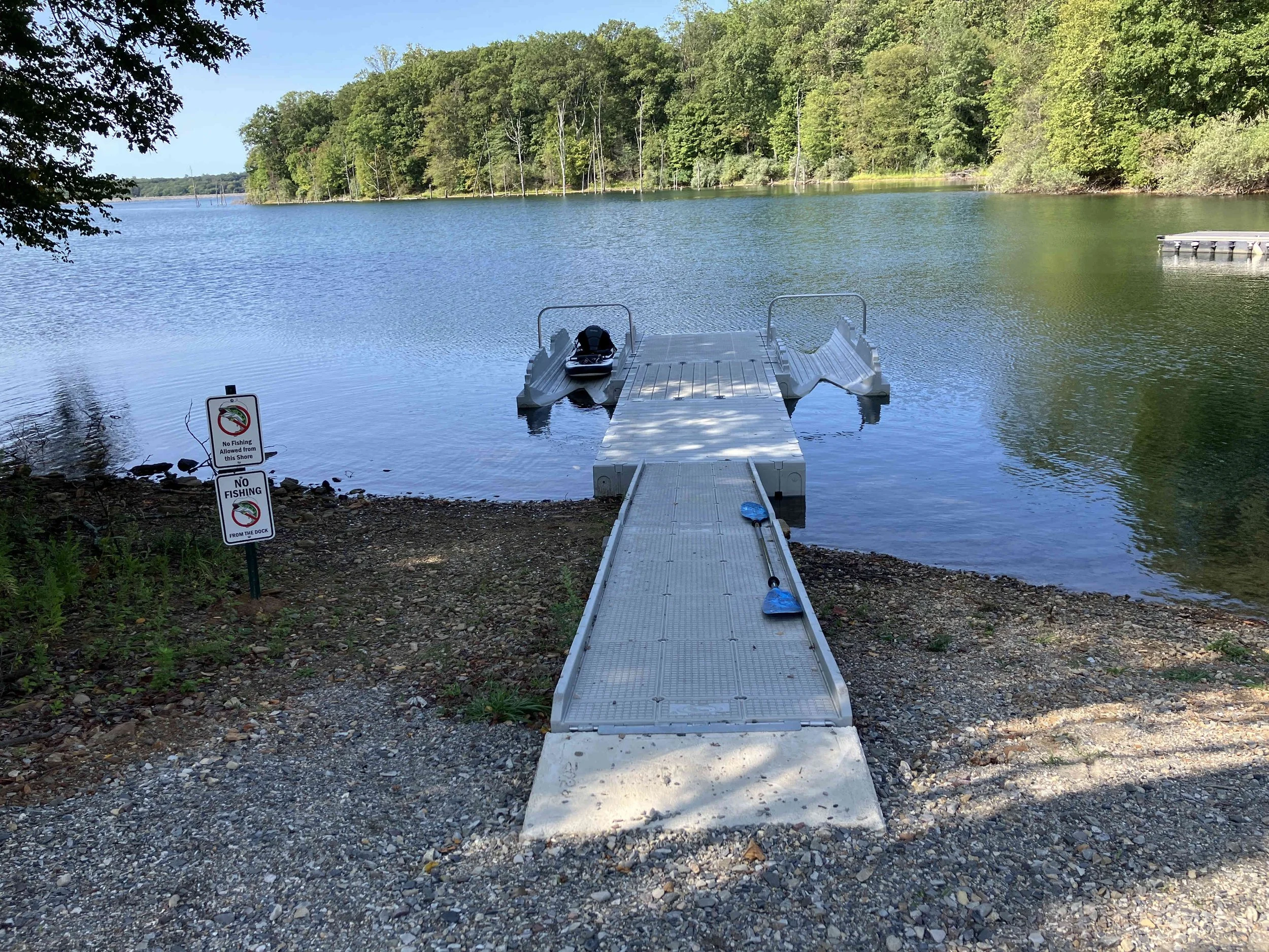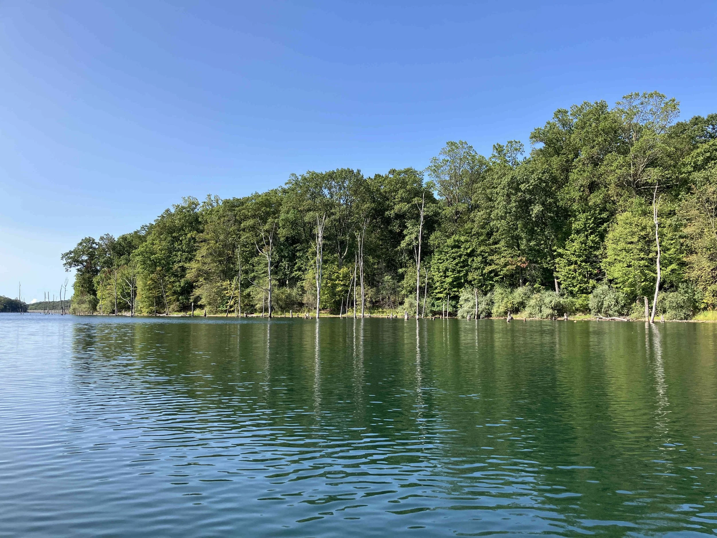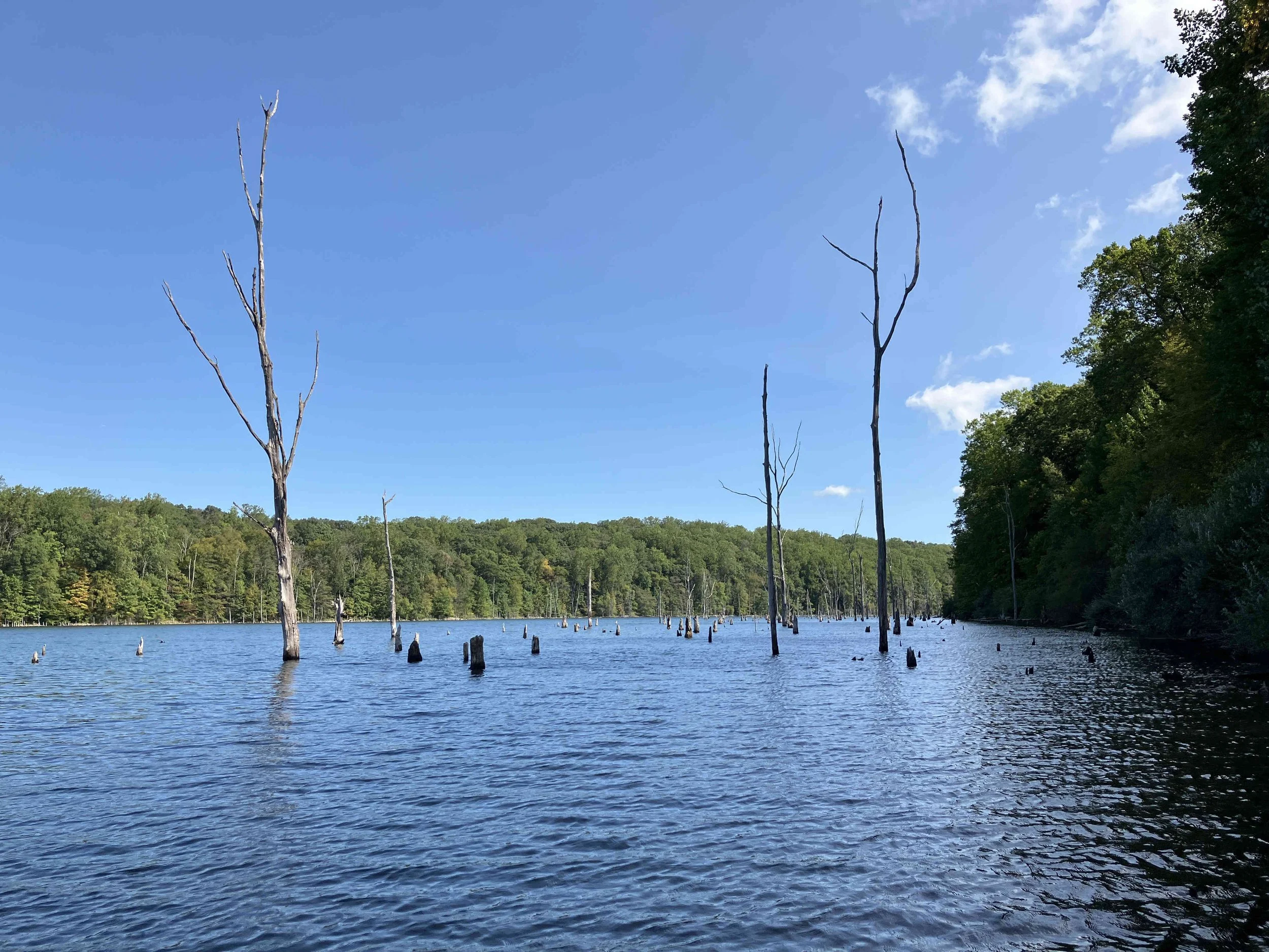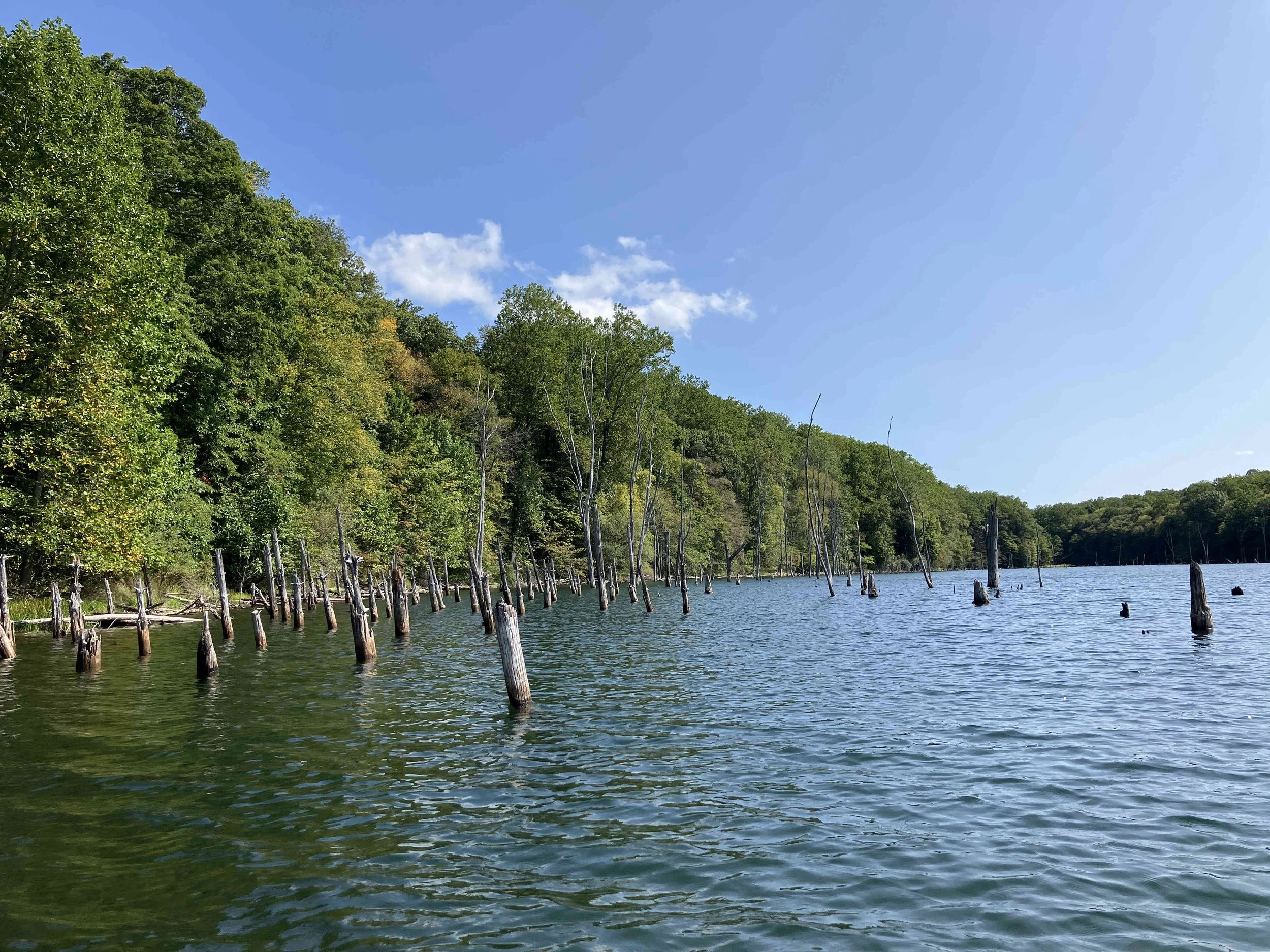 The launch site is at the end of Merrill Creek Road. Much of the shoreline had dead trees sticking out of the water. Be careful. The lake is pretty.
