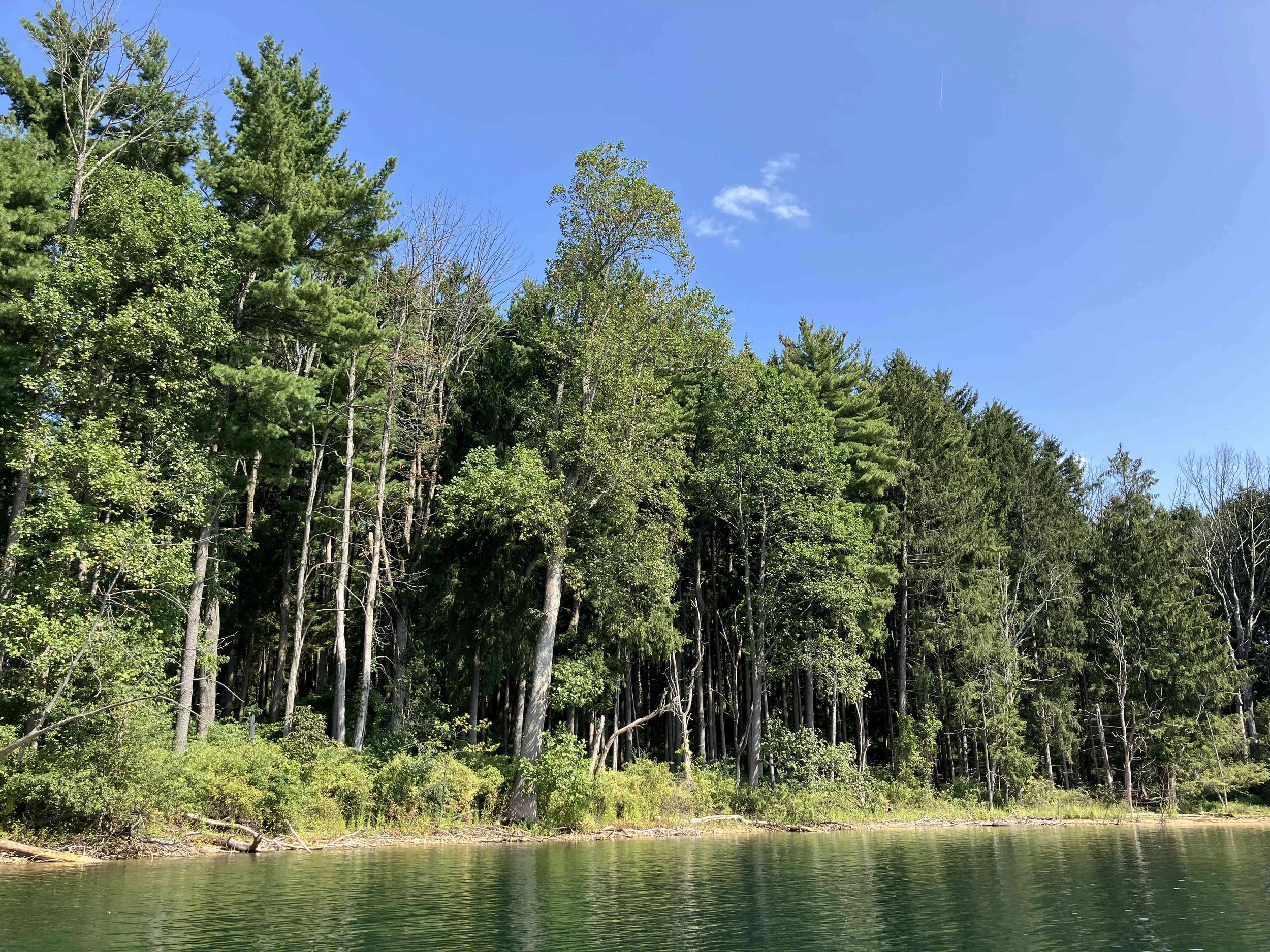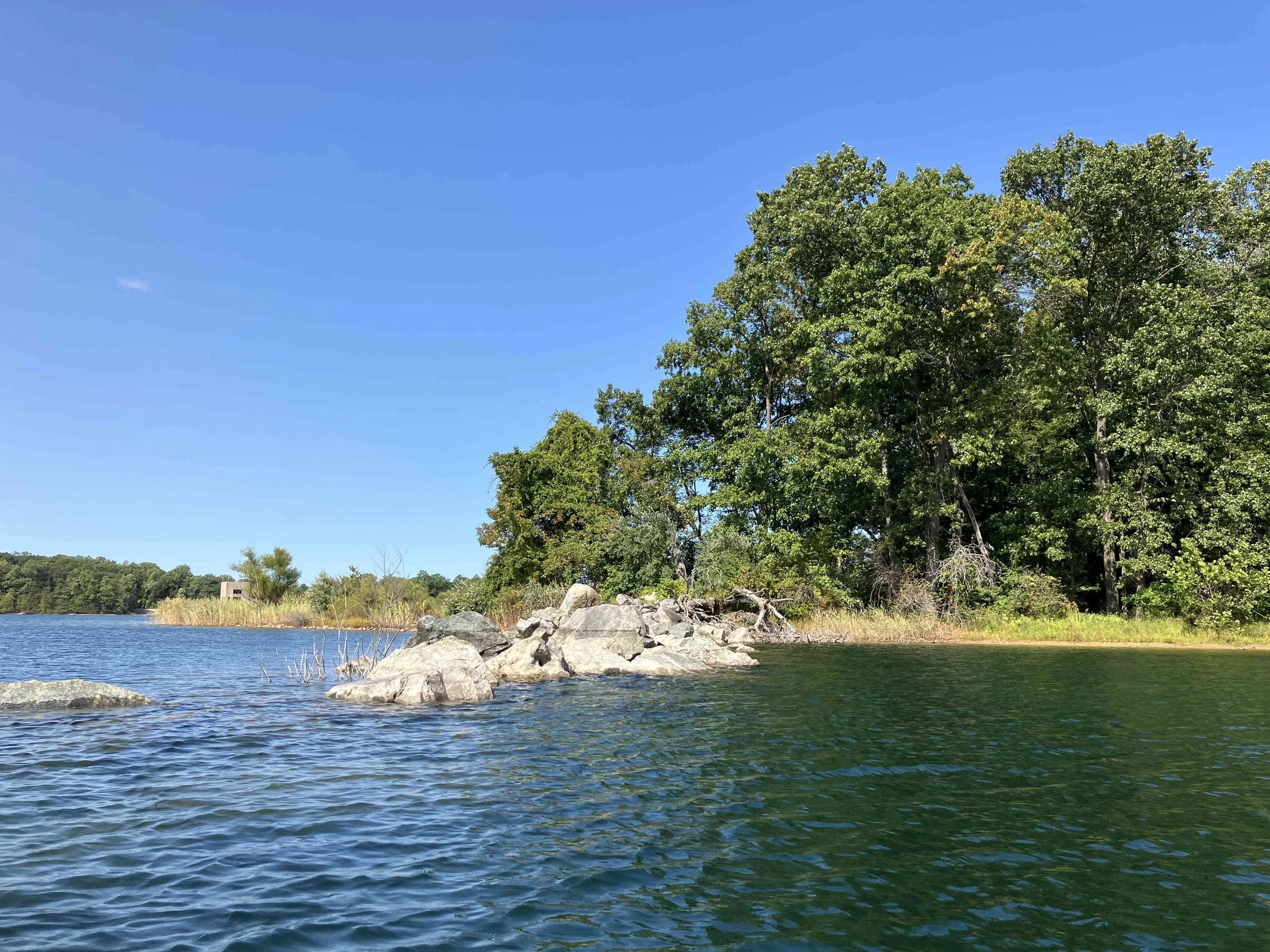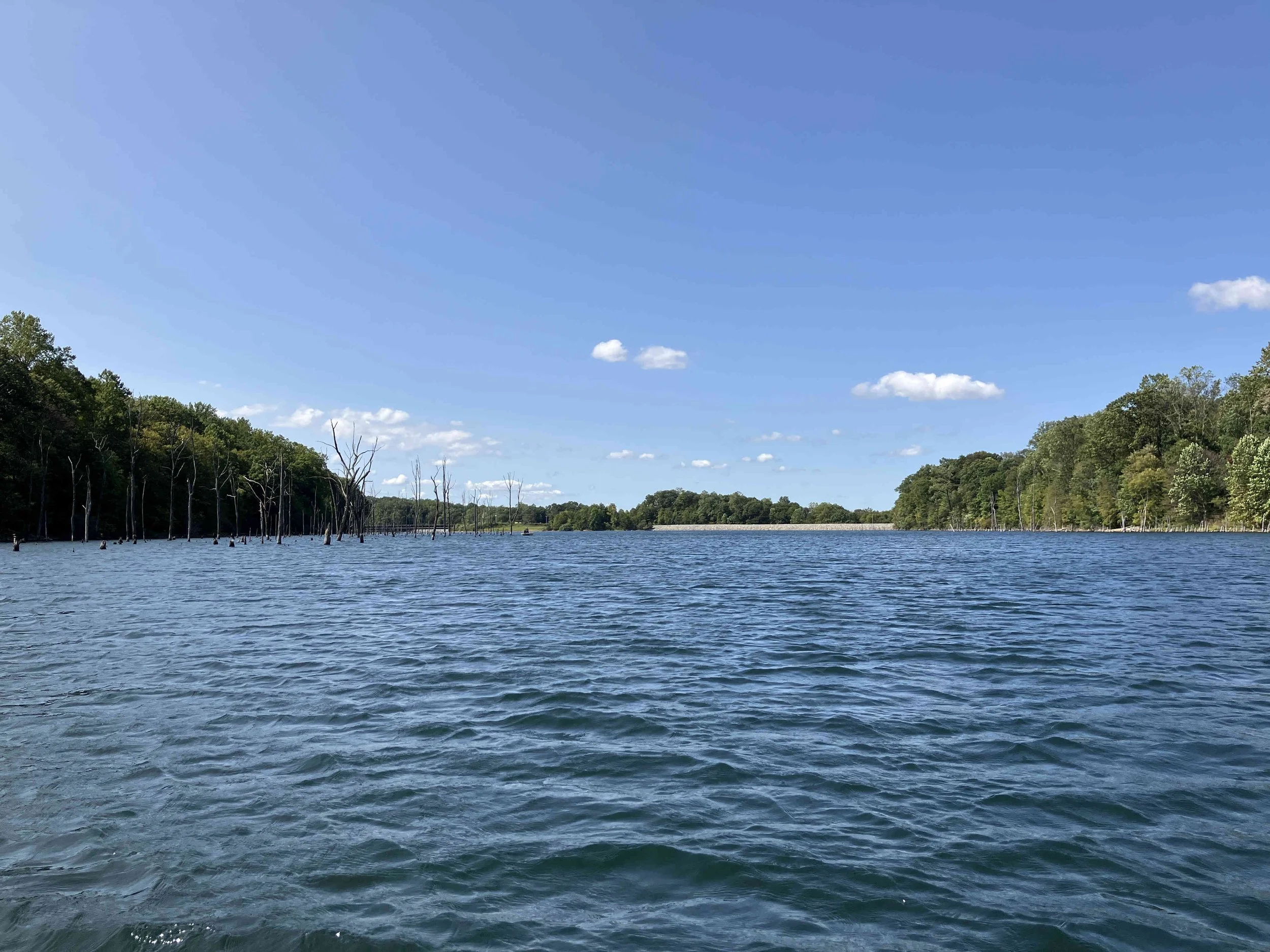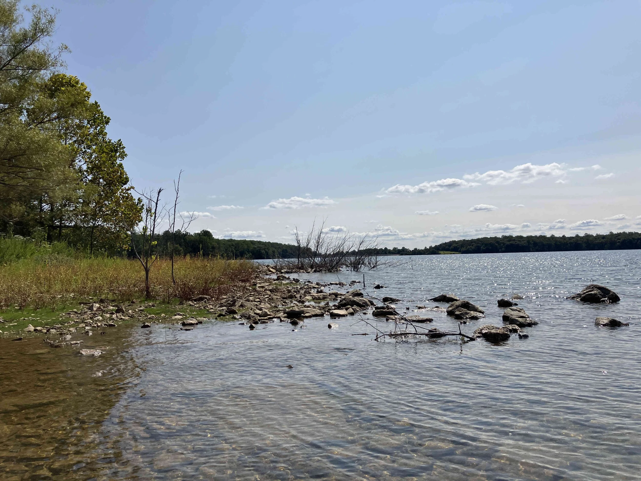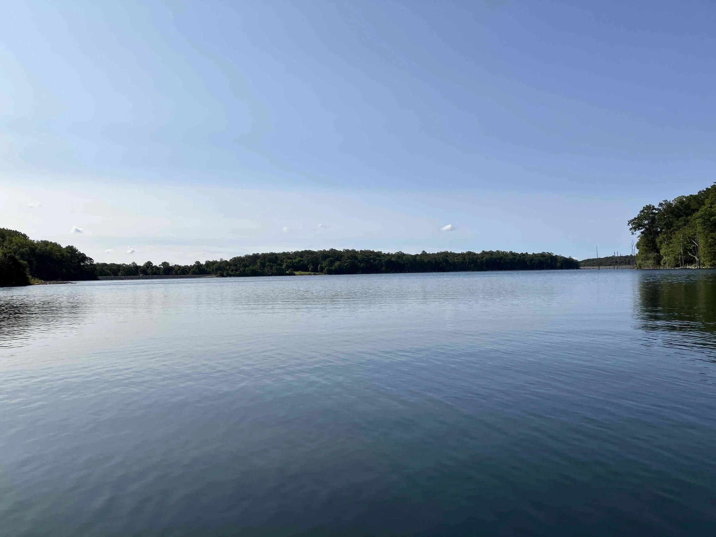 The launch site is at the end of Merrill Creek Road. Much of the shoreline had dead trees sticking out of the water. Be careful. The lake is pretty.