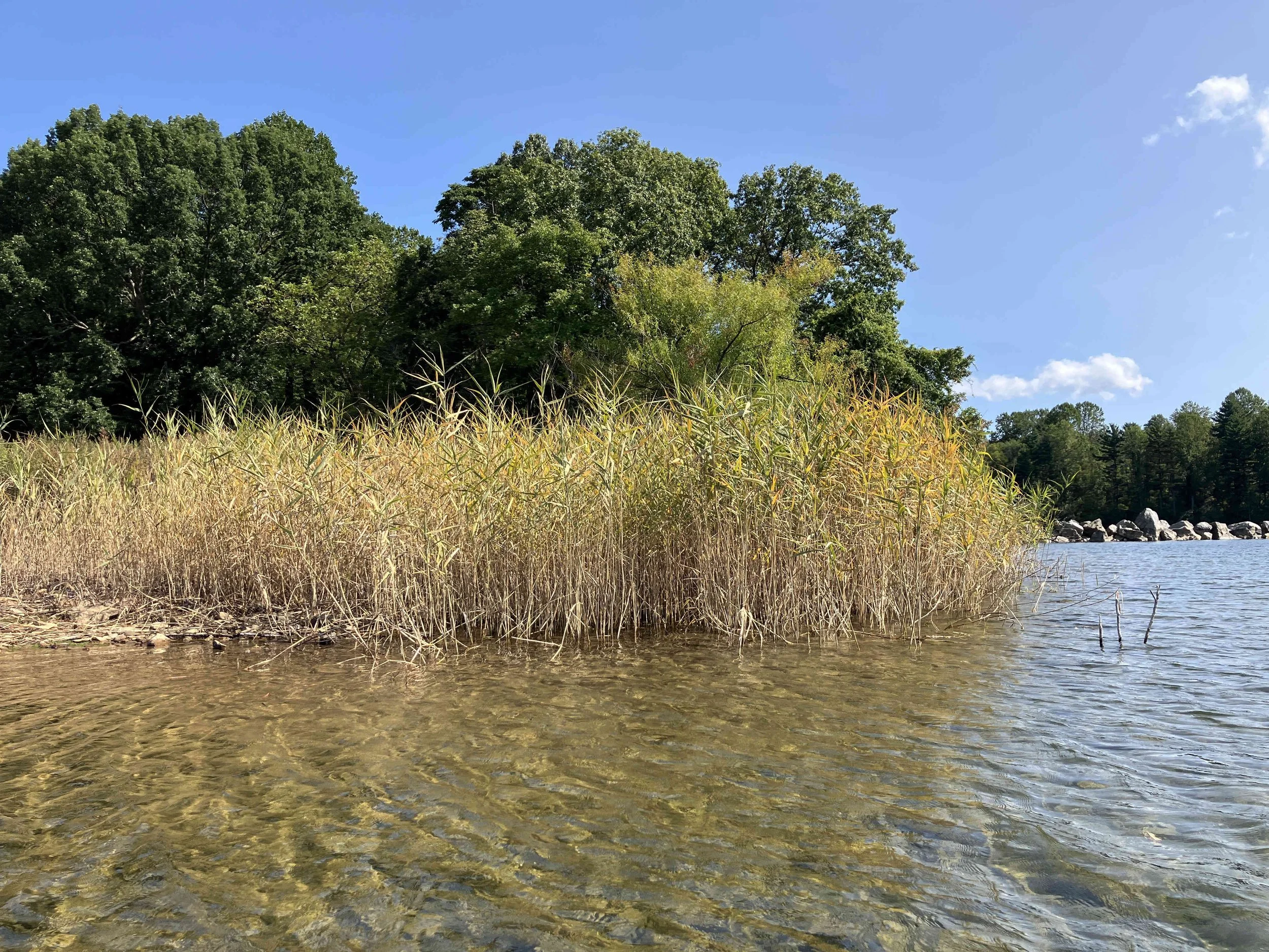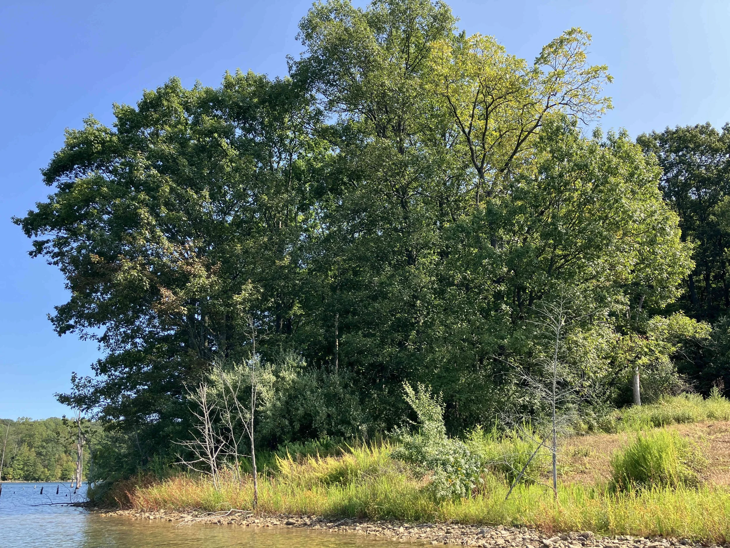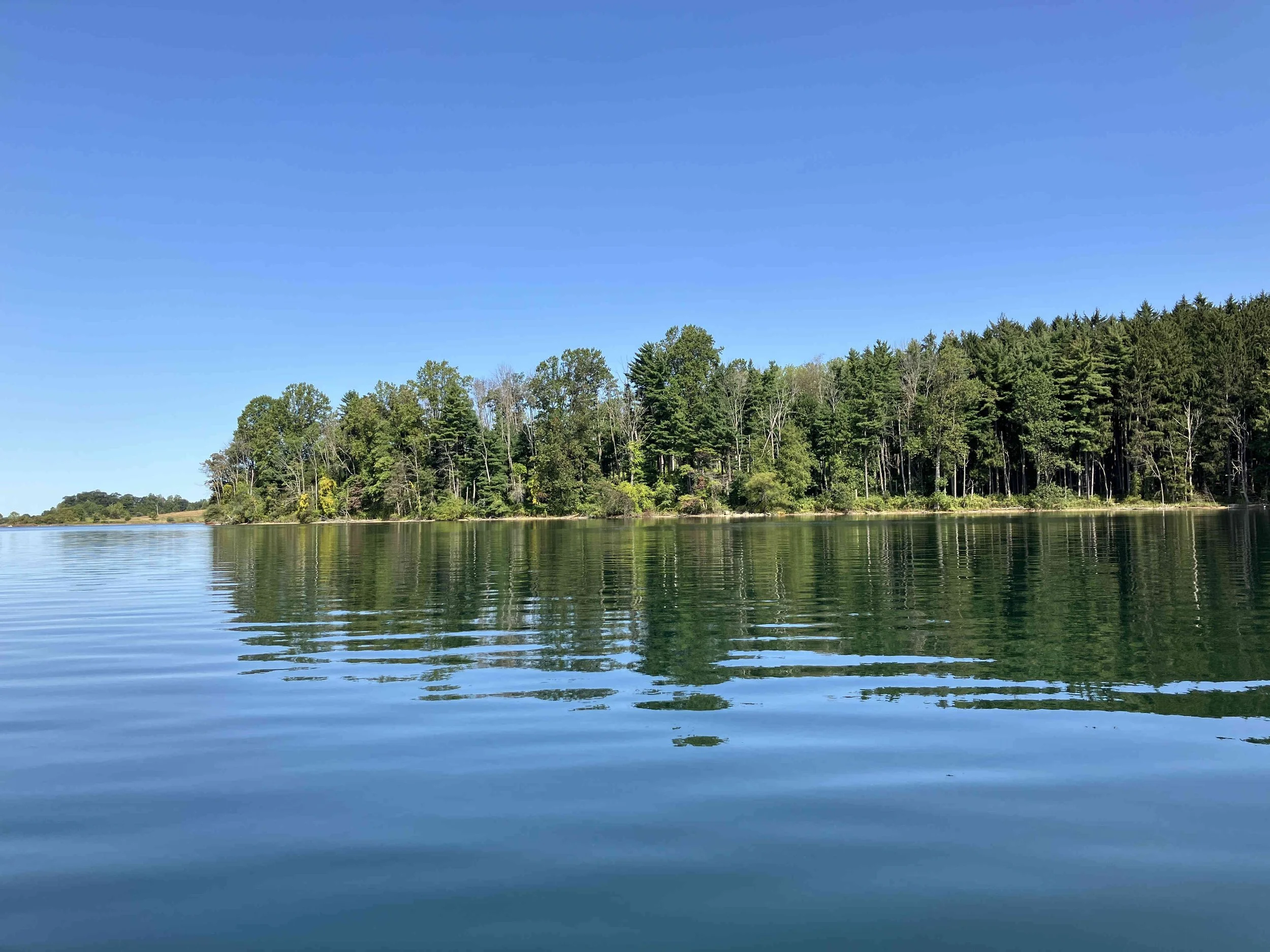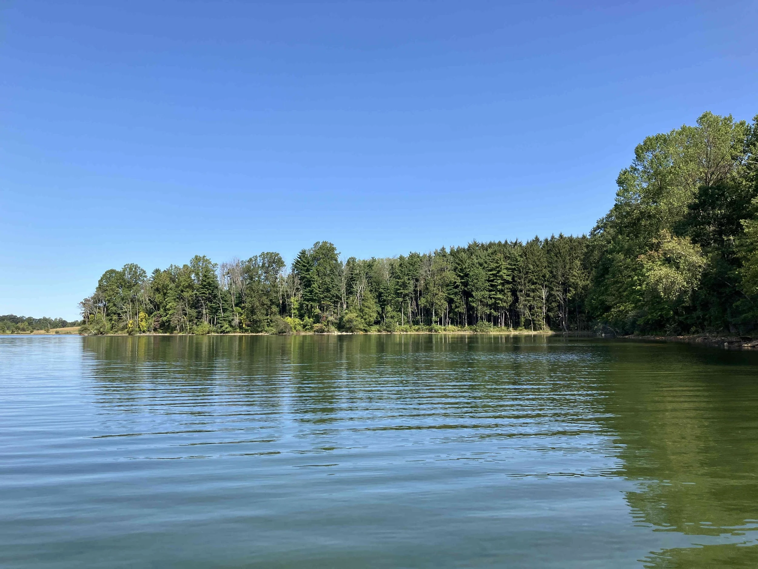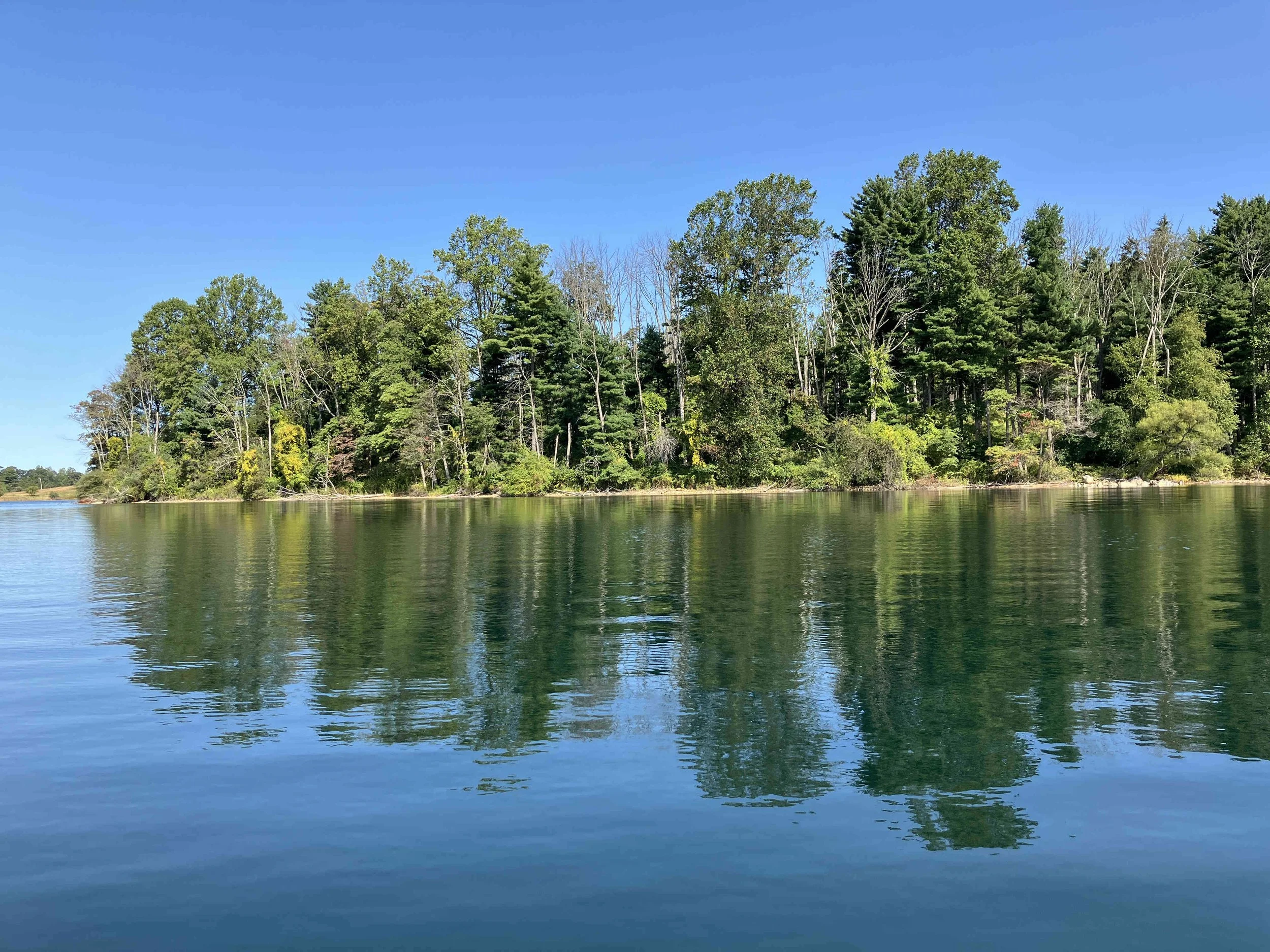 The launch site is at the end of Merrill Creek Road. Much of the shoreline had dead trees sticking out of the water. Be careful. The lake is pretty.