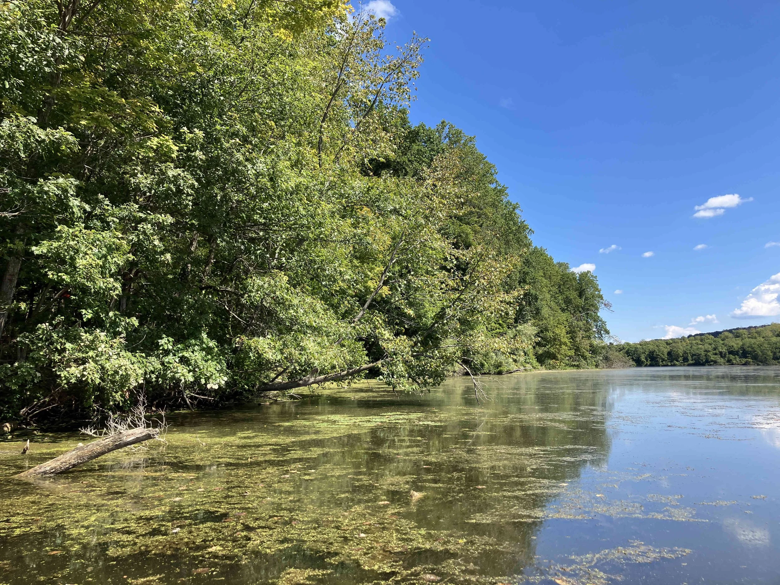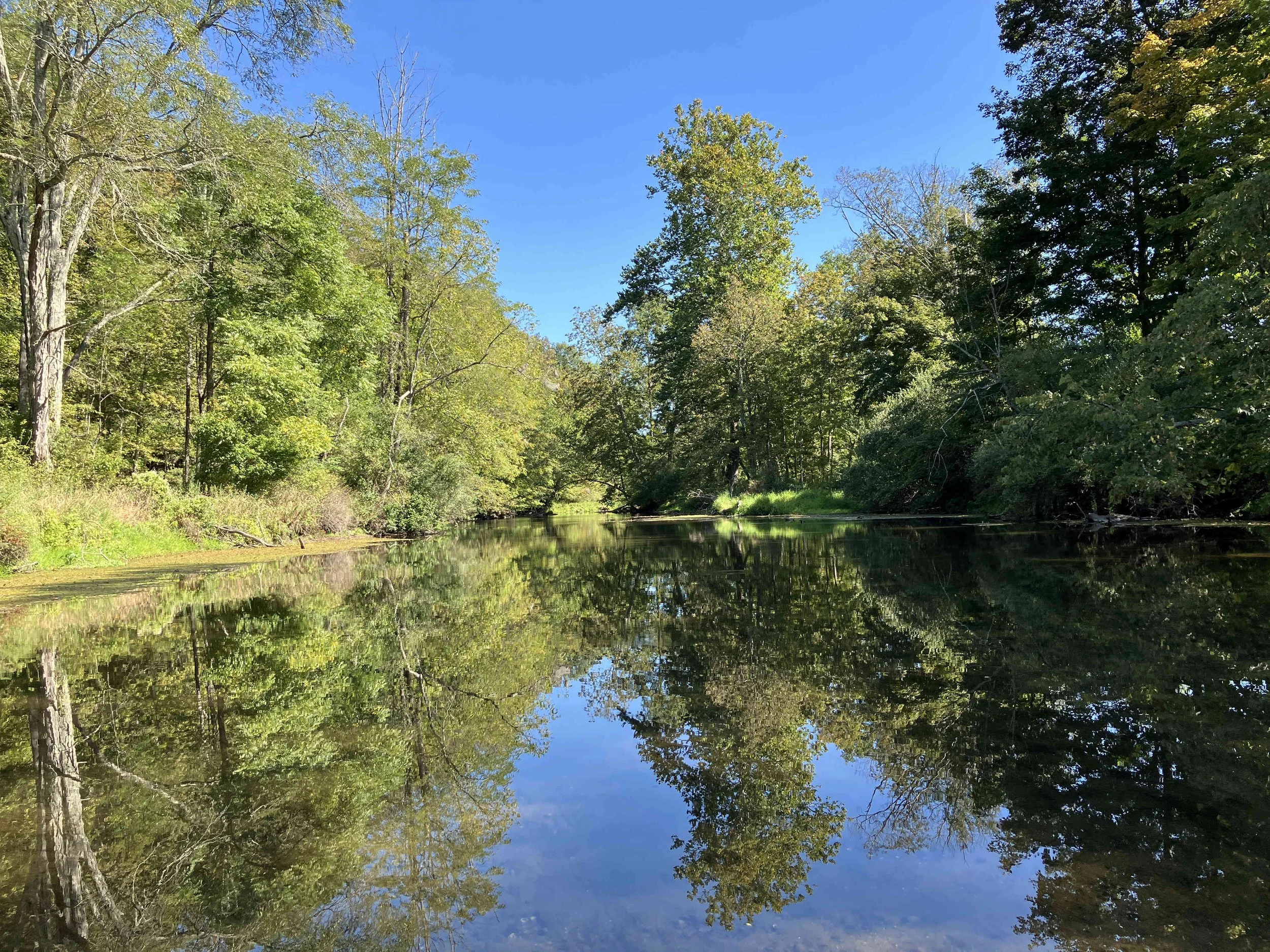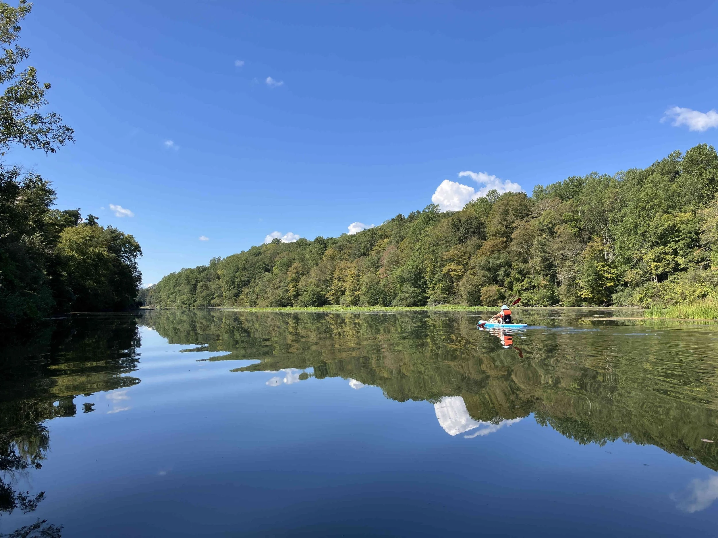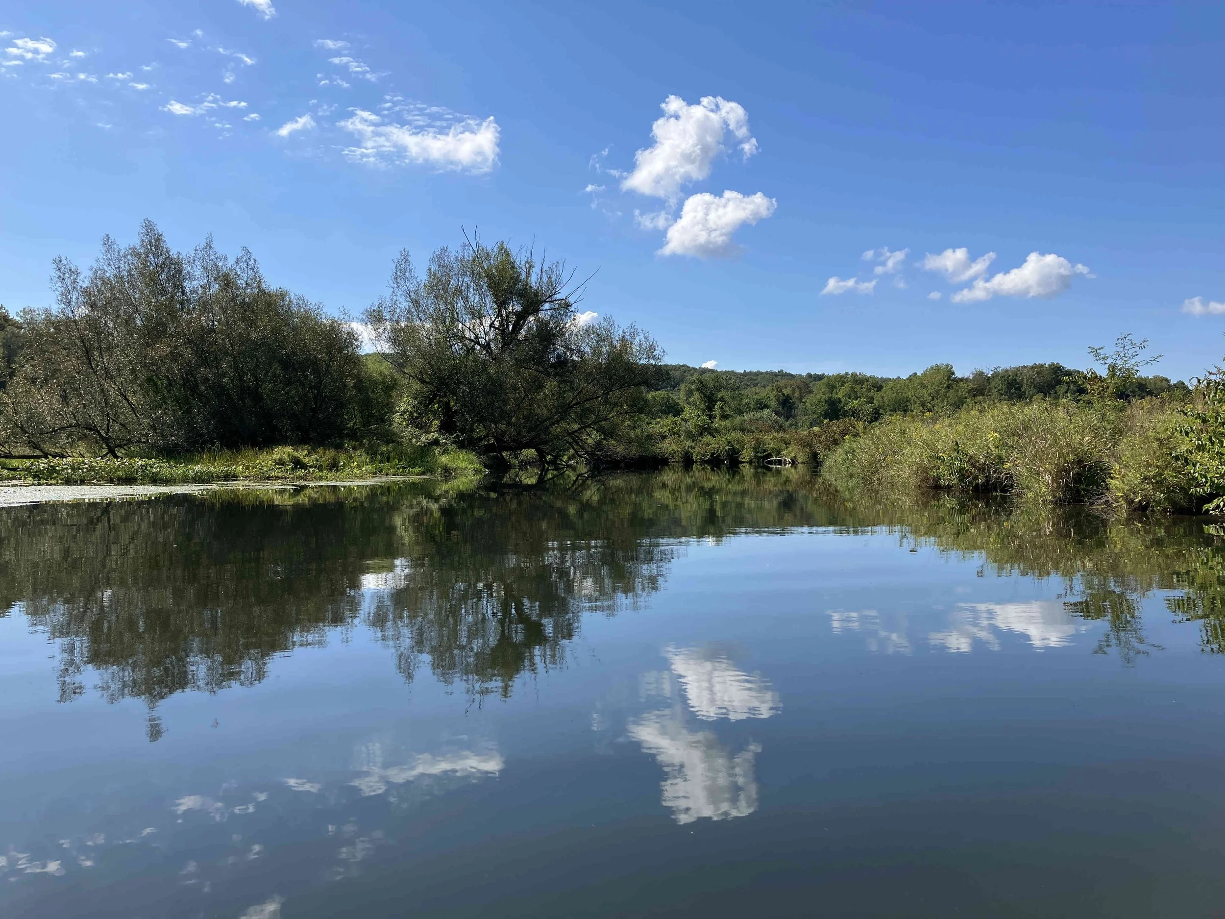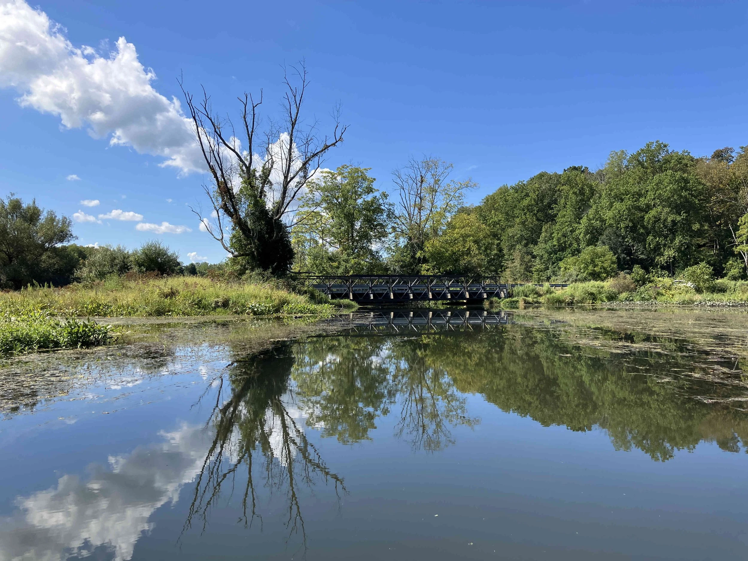 Paulinskill Lake (250 acres) is in Hampton Township, Sussex County. It is divided into three sections by bridges. The lower section is private property, so no kayaking. The middle and upper sections are in the Paulinskill River Wildlife Management Area. They are quite different in character. The only launch site is near Plotts Bridge.