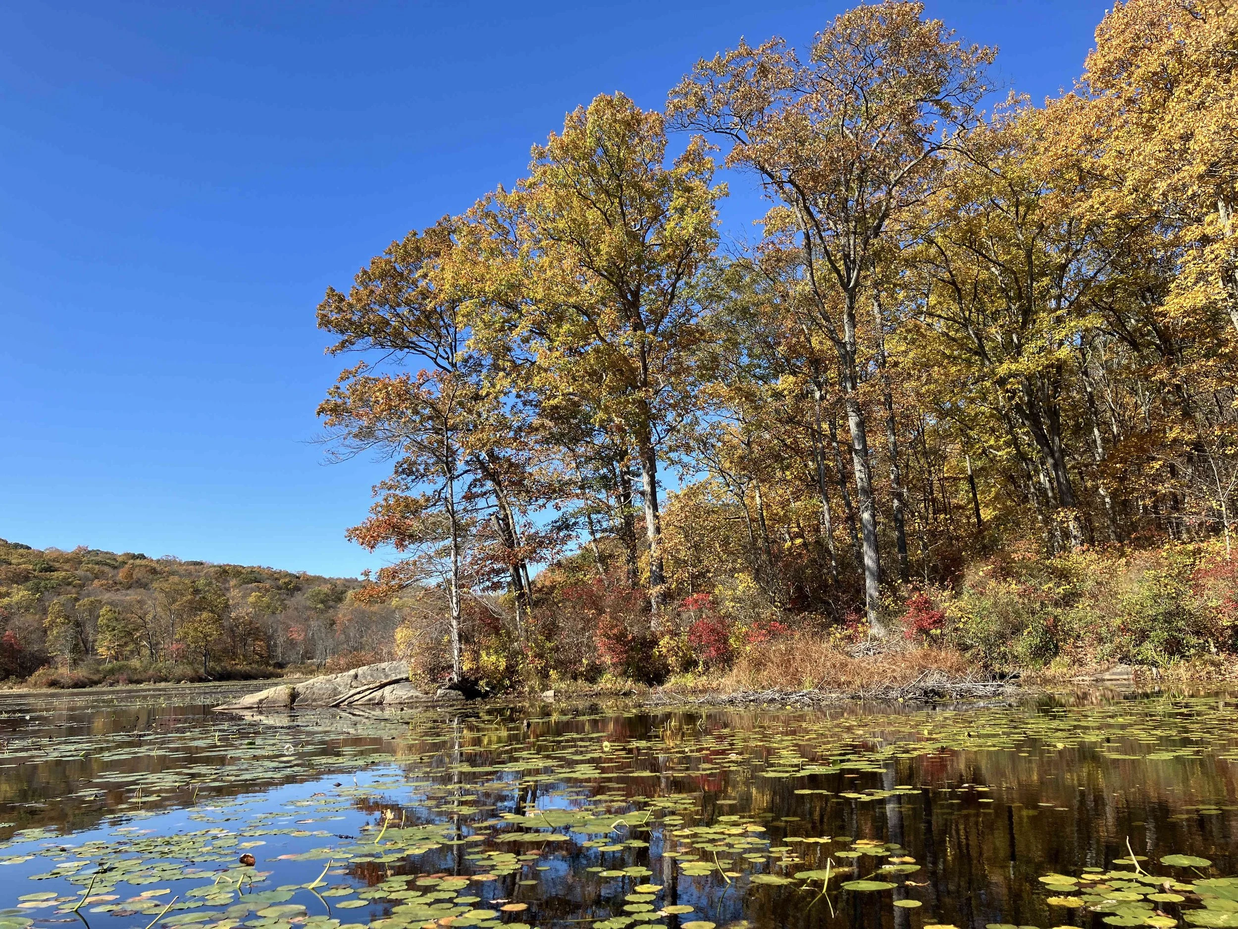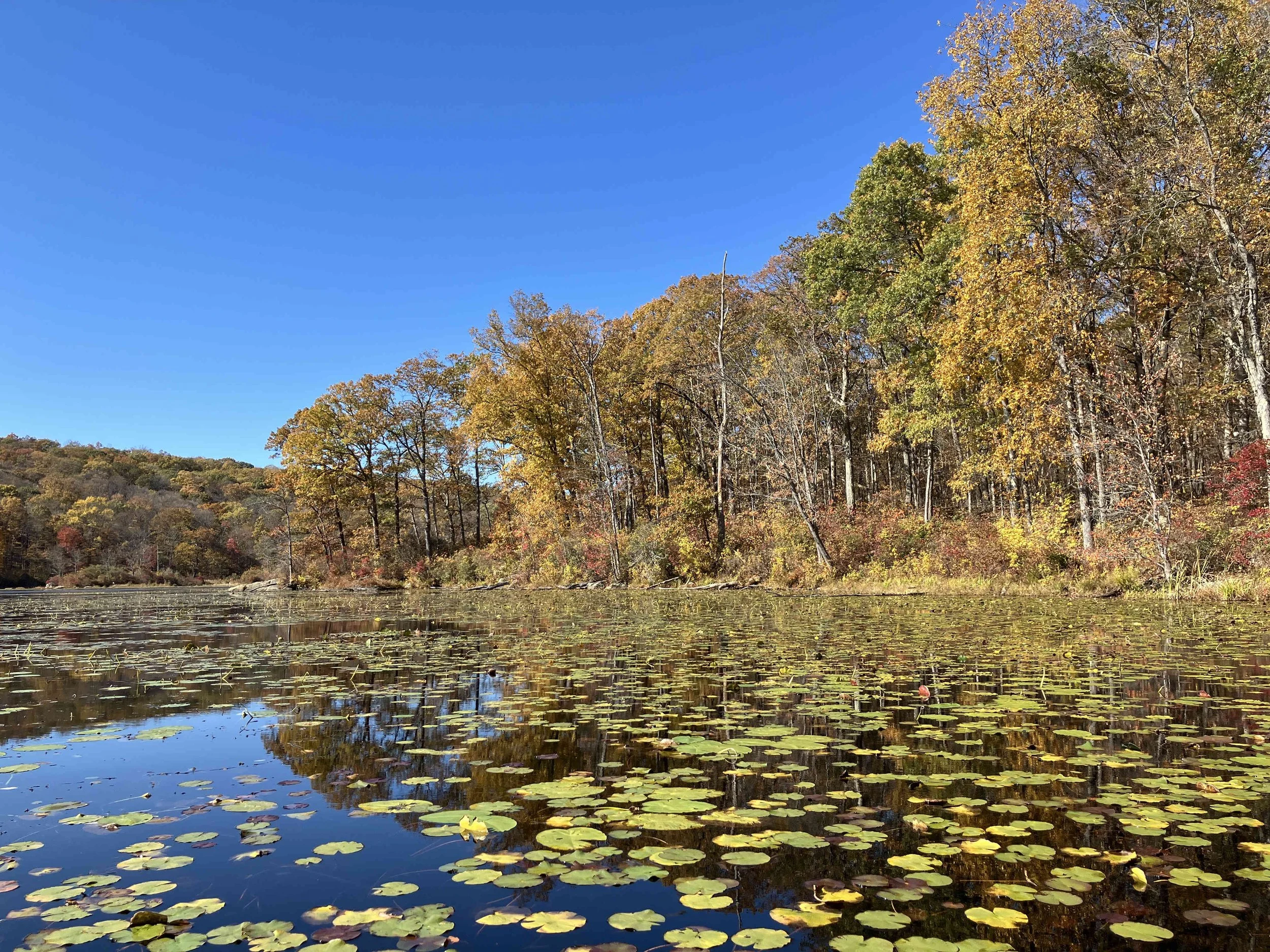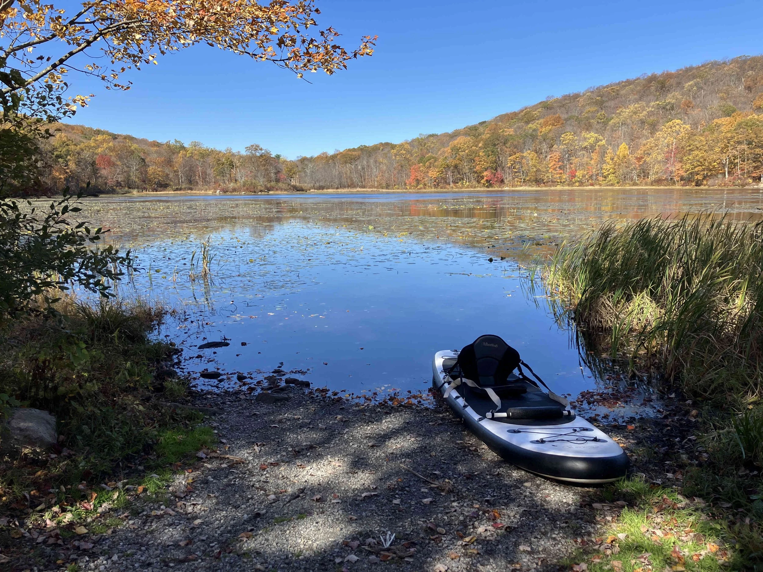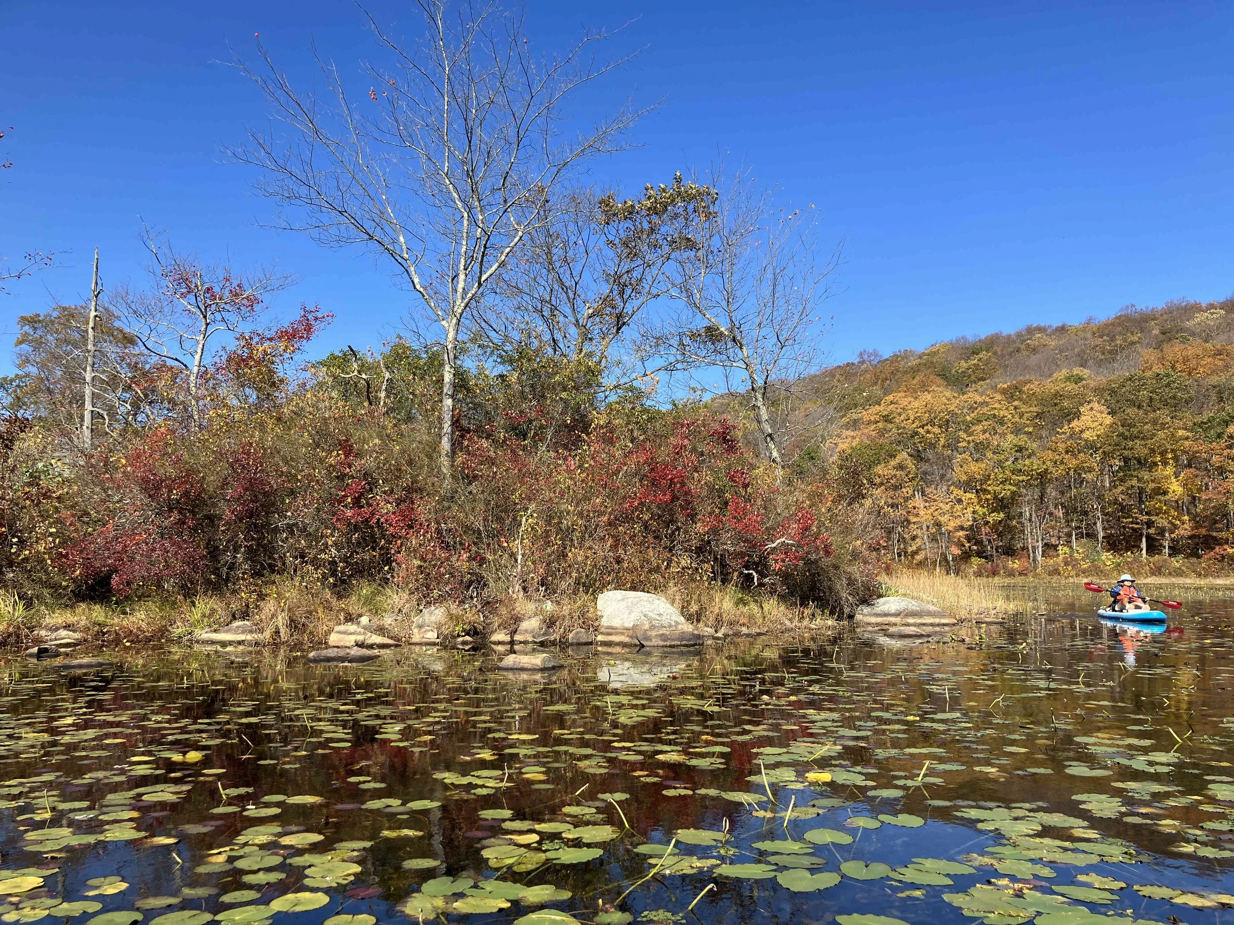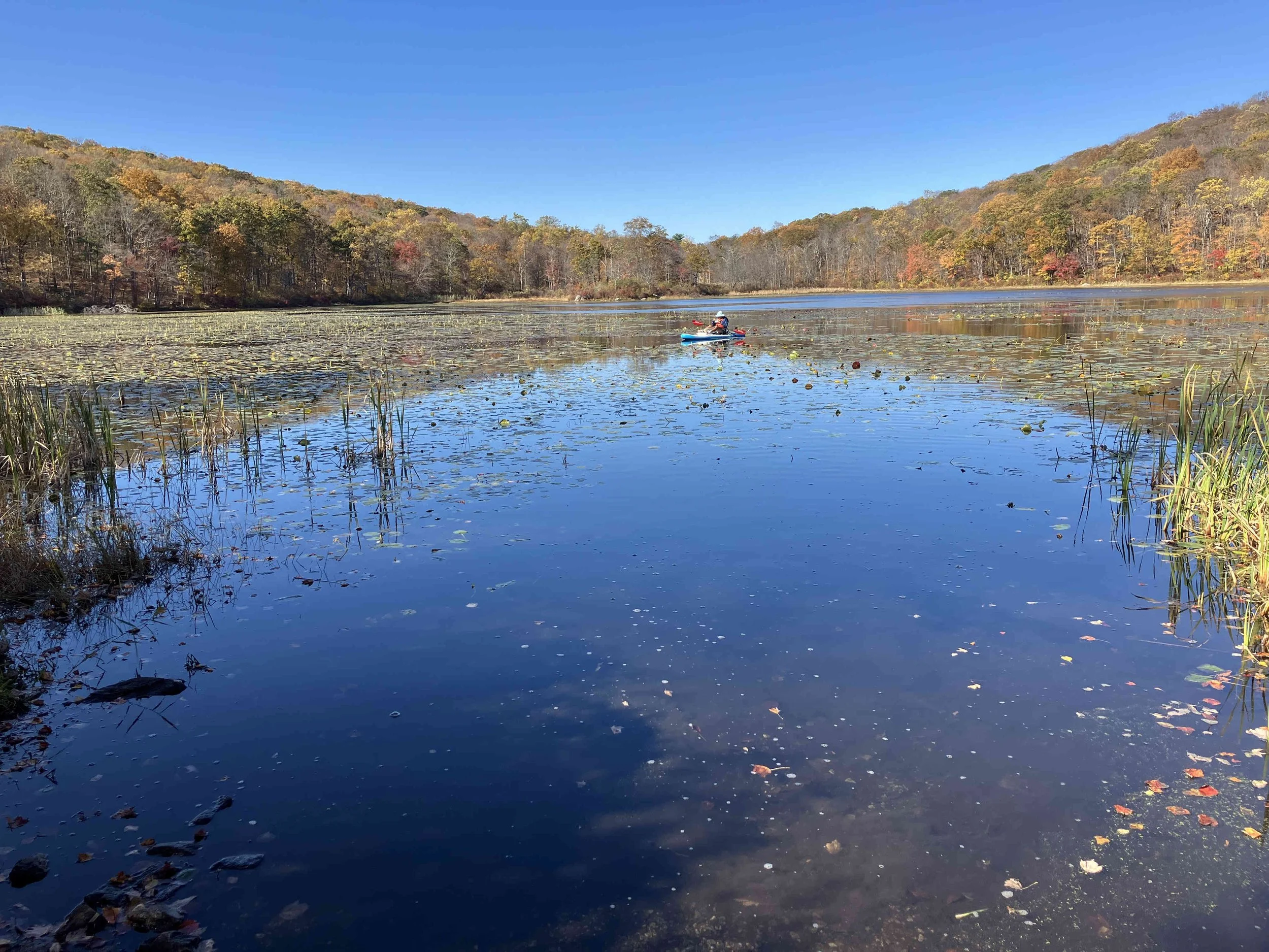 Ryker Lake (30 acres) is in Sparta Township, Sussex County. It is in the Sparta Mountain Wildlife Management Area. It is a shallow man-made lake with a launch site on the south end. When we visited in late October, it was easy to navigate. But it may be overgrown with weeds during the summer.