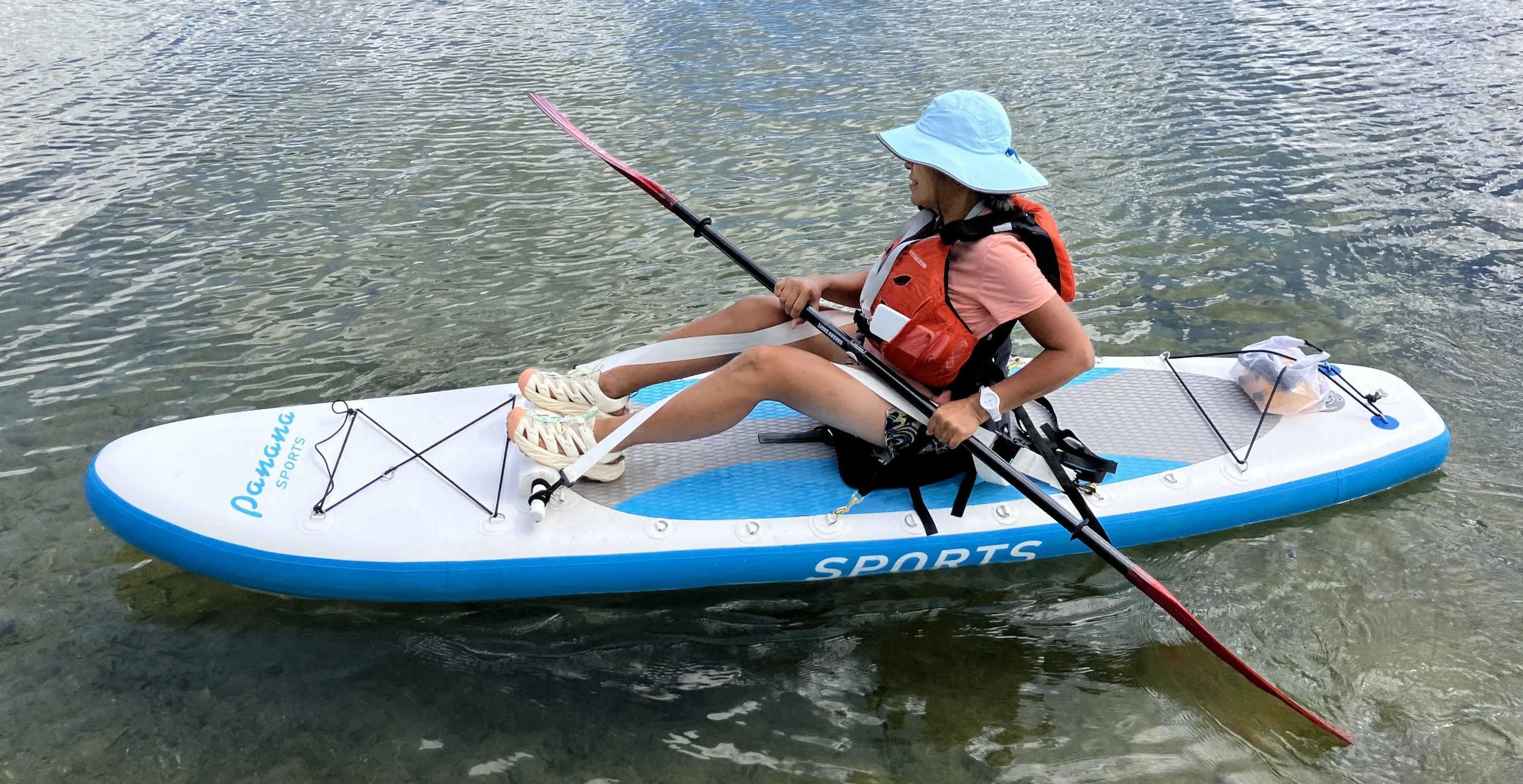 I built a prototype kayak for my partner, Ana. I started with the lightest and narrowest cheap inflatable stand-up paddle-board that I could find. I then added a seat, a footrest, some tie-downs (on the back – for her gear), plus thigh-straps – to secure Ana to the boat in choppy water. Below is a picture of Ana in her kayak on a local lake. Note the following additions:
