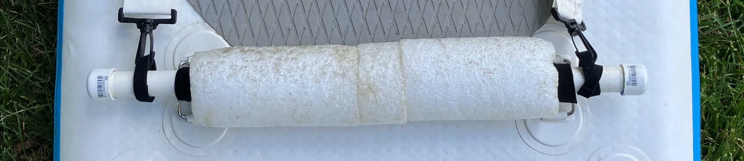 Cut the swimming noodle to the length of the distance between the two d-rings that will secure the footrest. Insert it on the PVC pipe and place it in the middle. Securely attach the PVC pipe to the two d-rings on the boat however way you wish. I used Velcro tape. Below is a finished footrest: